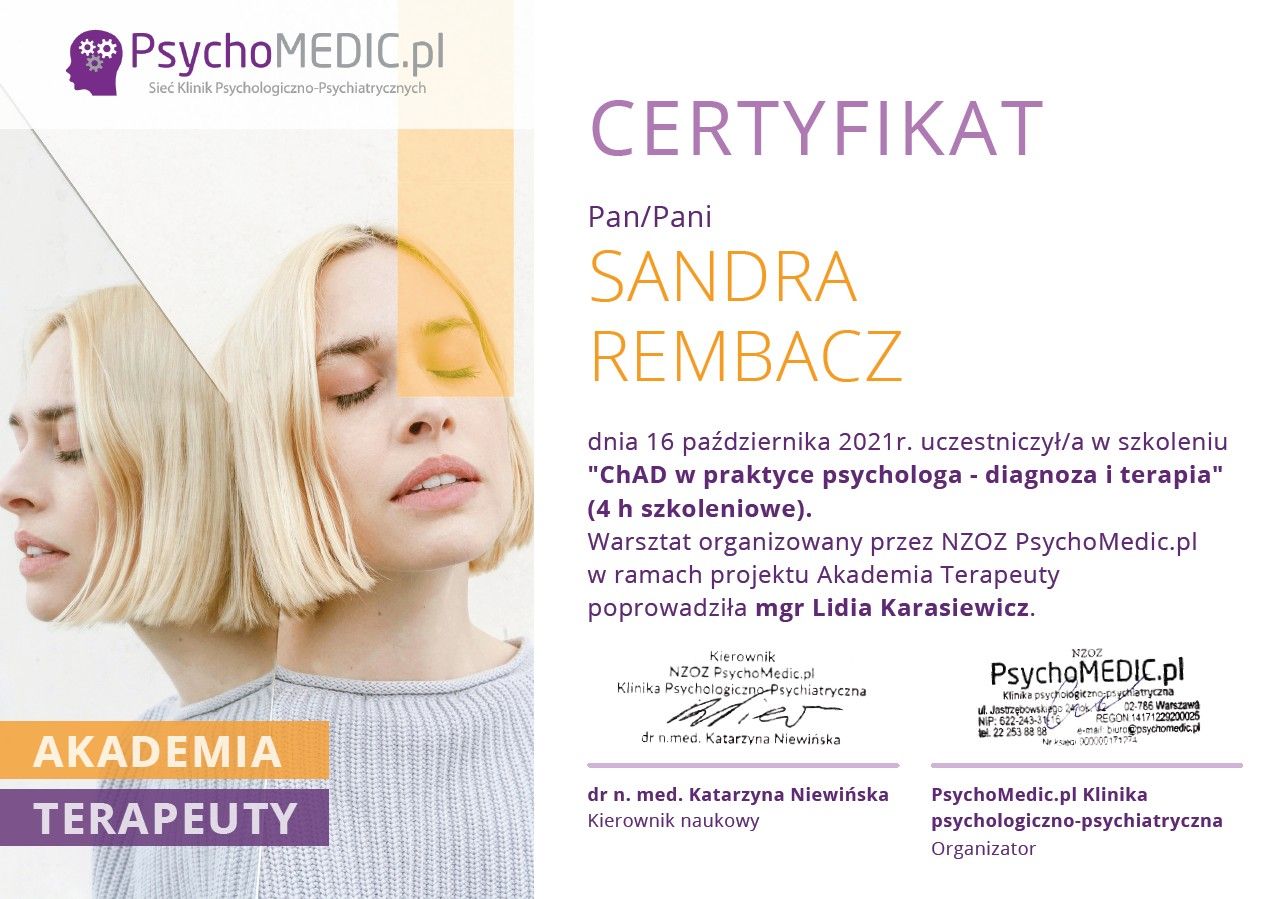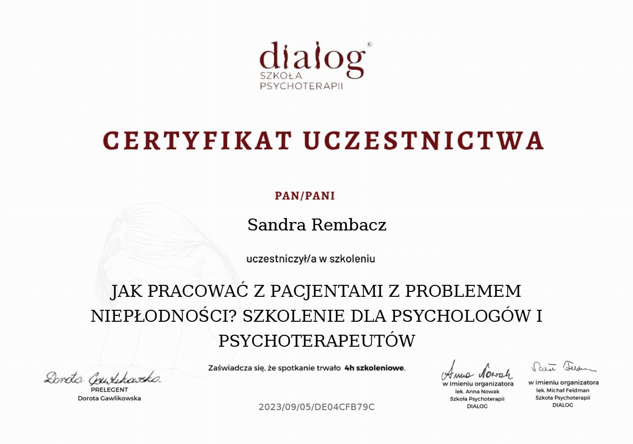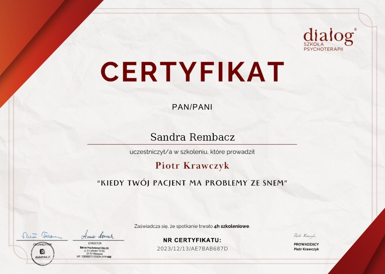 Czy Sandra Rembacz przyjmuje online, bez konieczności pojawiania się w placówce?Tak, Sandra Rembacz oferuje konsultacje online. Wybierz opcję „konsultacja online” przy umawianiu wizyty, a zobaczysz dostępne terminy.