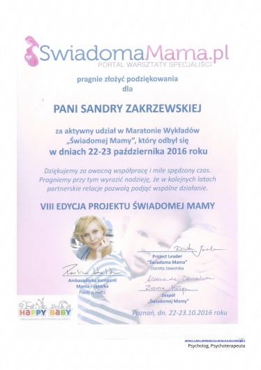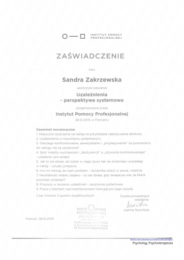 Pierwsze i kolejne wrażenia po spotkaniach bardzo pozytywne. Poczułam się komfortowo, a postawa Pani Sandry pozwoliła mi odczuć, że jestem przez Nią rozumiana. Obecna diagnoza wydaje mi się również bardzo trafna, więc optymistycznie czekam na kolejne konsultacje. Polecam.