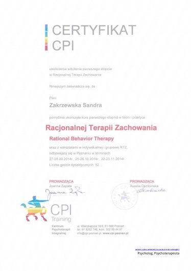 Stosuję również metody poznawczo-behawioralne. Racjonalna Terapia Zachowania (Rational Behavior Therapy RBT), pozwala w szybki sposób reagować na trudności klienta i prowadzi do zniwelowania objawów.