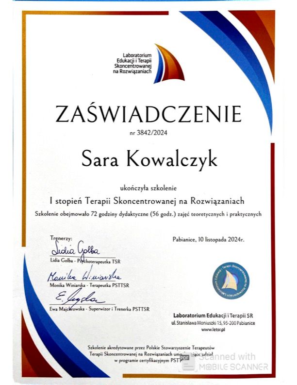 Z całego serca polecam. Pani Sara pomaga mi przejść przez trudną sytuację w życiu. Wykazuje się dużą empatią, pomaga mi lepiej siebie zrozumieć i wyciąga trafne wnioski.