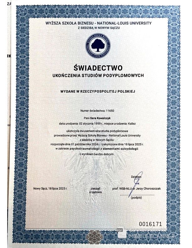 Jestem psychologiem i psychotraumatologiem, absolwentką jednolitych studiów magisterskich na Uniwersytecie Gdańskim, gdzie zrealizowałam ścieżkę specjalizacyjną z psychologii klinicznej. Ukończyłam I stopień szkolenia Terapii Skoncentrowanej na Rozwiązaniach (TSR). Szczególnie interesuje mnie tematyka traumy oraz jej wpływ na funkcjonowanie i zdrowie psychiczne.