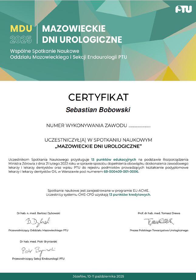 Szczególną uwagę przykładam do indywidualnego podejścia do pacjenta, dokładnej analizy objawów oraz doboru optymalnego leczenia - zarówno zachowawczego, jak i zabiegowego. Stale podnoszę swoje kwalifikacje uczestnicząc w szkoleniach, konferencjach oraz sympozjach organizowanych przez Polskie Towarzystwo Urologiczne, aby zapewnić pacjentom opiekę zgodną z aktualną wiedzą medyczną.