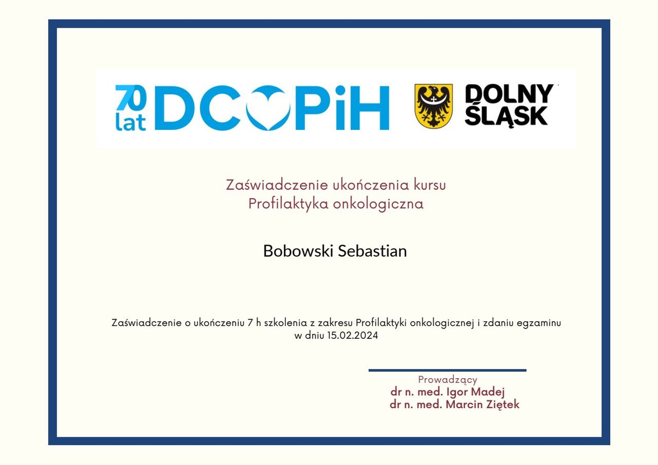 Jestem lekarzem w trakcie specjalizacji z Urologii oraz absolwentem Uniwersytetu Medycznego w Łodzi. Odbyłem staż podyplomowy w 4. Wojskowym Szpitalu Klinicznym we Wrocławiu. Pracuje w Dolnośląskim Szpitalu Specjalistycznym im. T. Marciniaka we Wrocławiu.