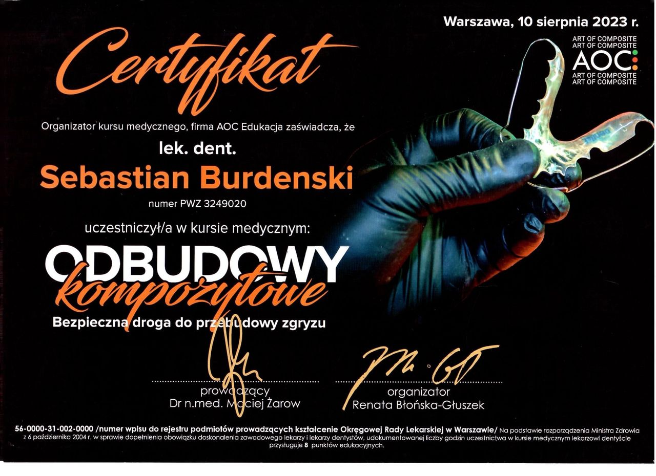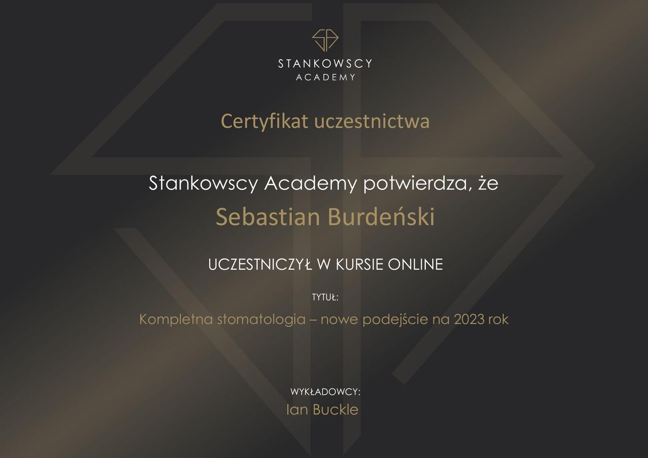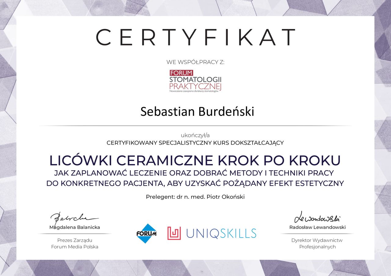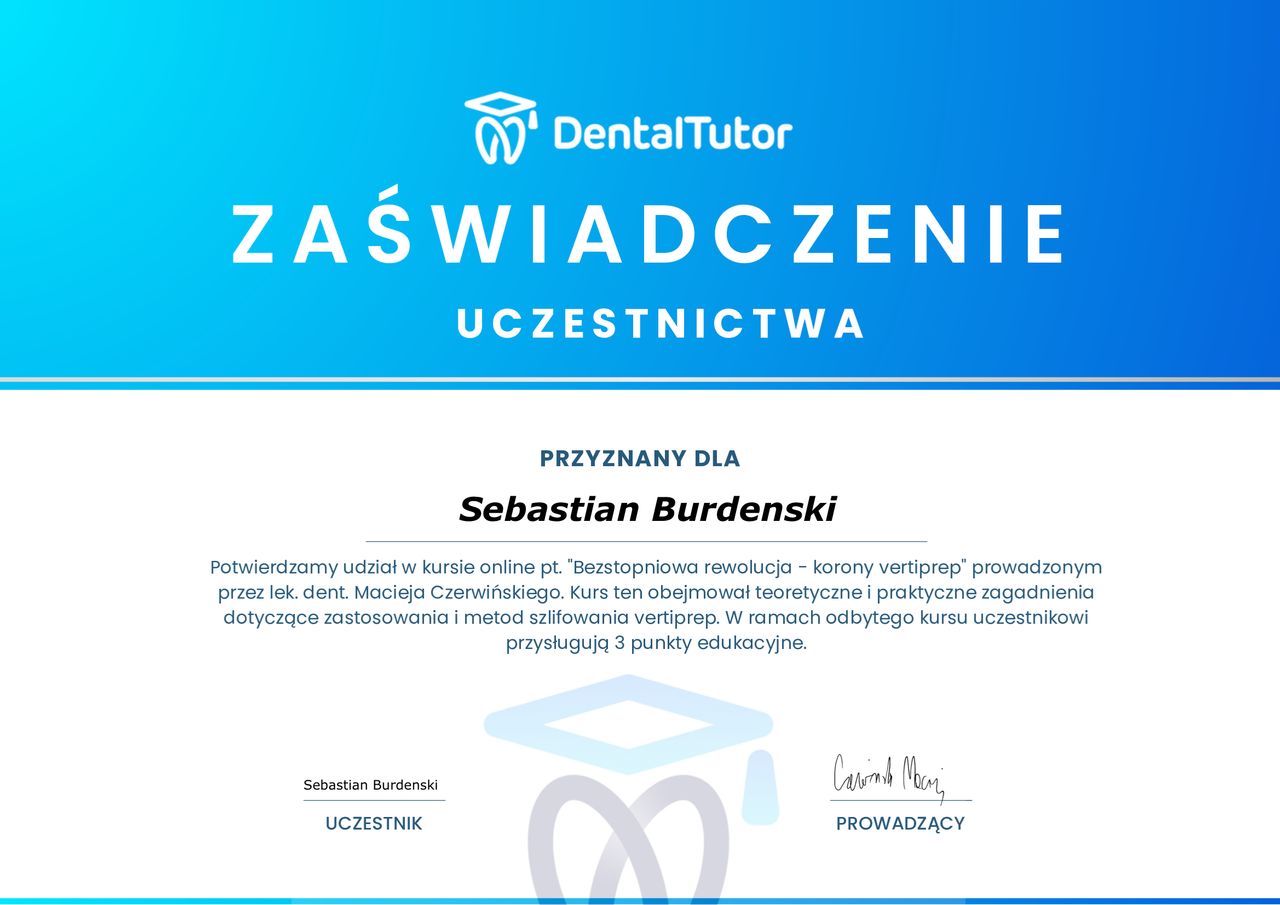Jaki jest zakres porad oferowanych przez Sebastian Burdeński?Sebastian Burdeński to stomatolog. Na podstawie swojego doświadczenia i wykształcenia Sebastian Burdeński oferuje usługi takie jak: Konsultacja stomatologiczna, Przegląd stomatologiczny, przegląd stomatologiczny + plan leczenia, wybielanie nakładkowe, wybielanie zębów systemem Prevdent, RTG pantomogram, zdjęcia cefalometryczne, Tomografia szczęki i żuchwy, Tomografia wycinkowa (obszar 3-4 zębów), konsultacja protetyczna.