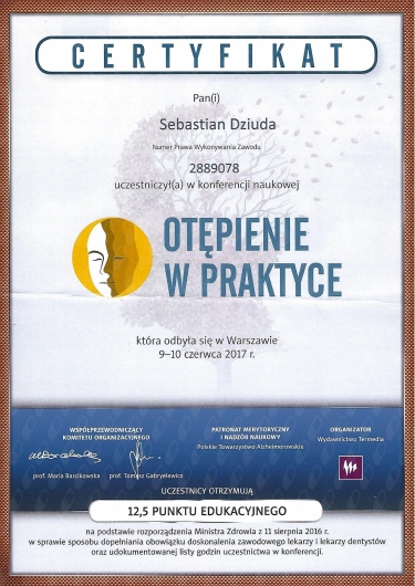 Jak Sebastian Dziuda umawia wizyty?Sebastian Dziuda używa kalendarza ZnanyLekarz, dlatego na stronie widzisz aktualne terminy. Wystarczy, że wybierzesz datę i godzinę, które odpowiadają Ci najbardziej. Umawianie wizyty jest darmowe, a tuż przed terminem wyślemy Ci przypomnienie.