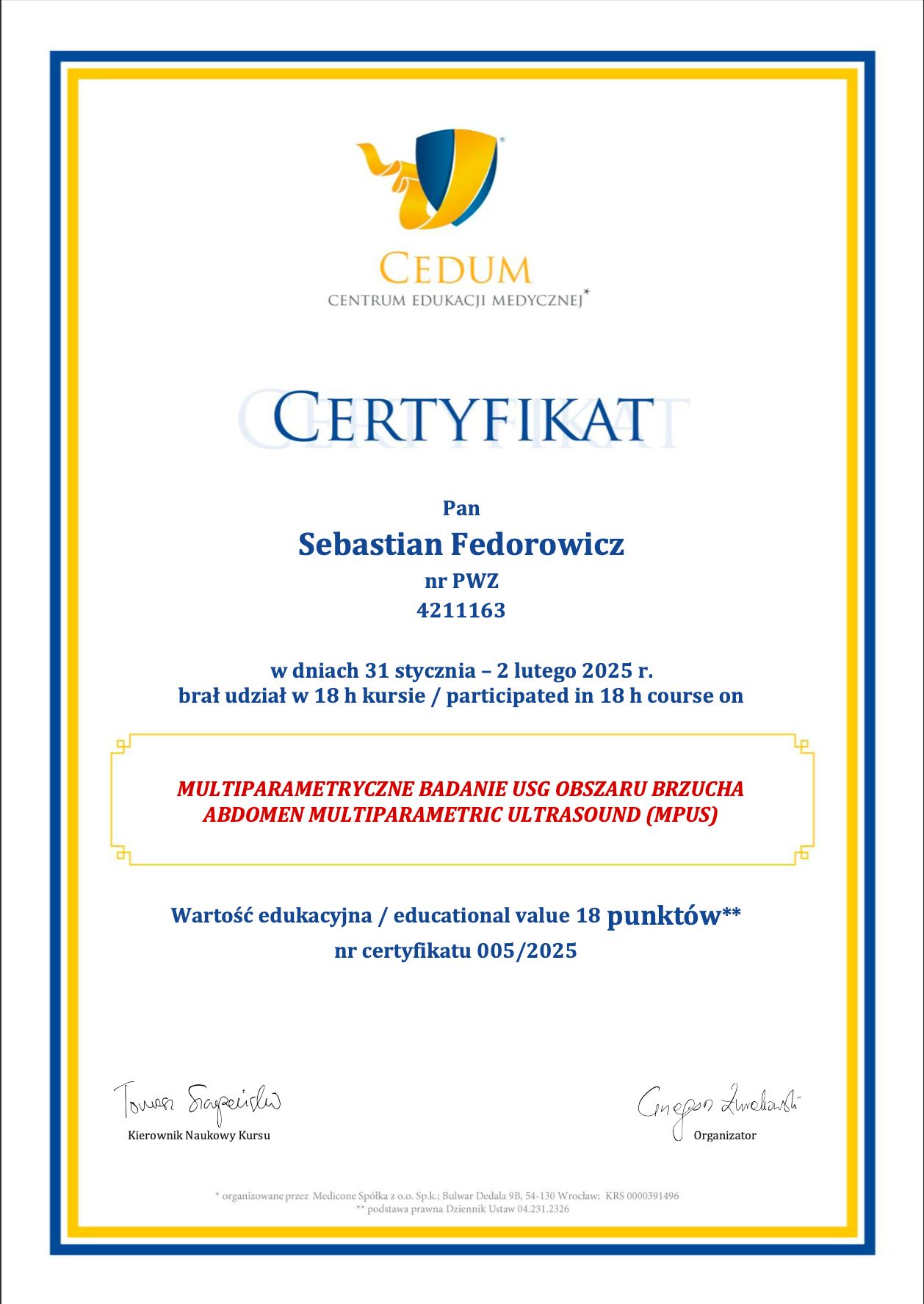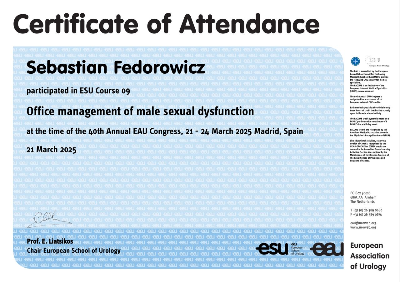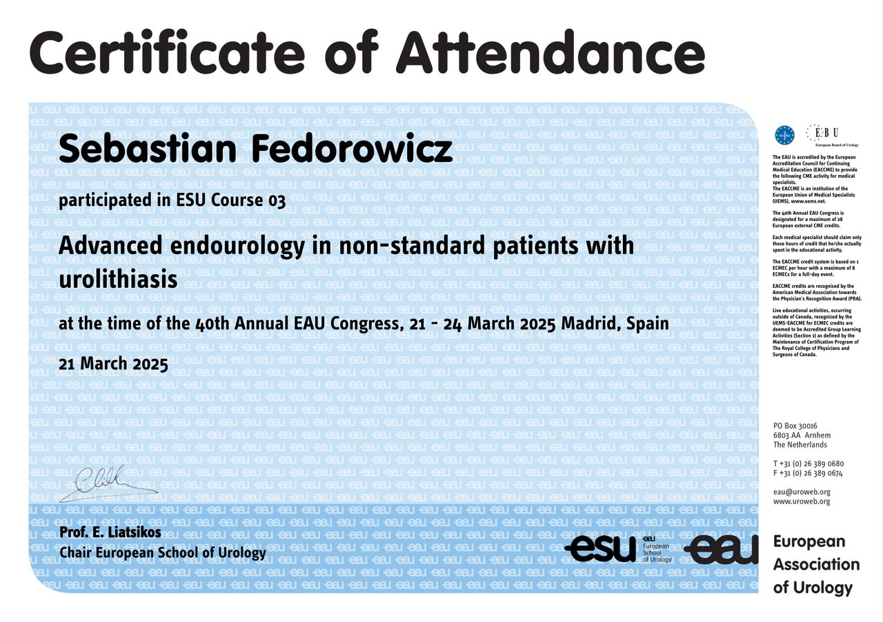 Jako członek Europejskiego Towarzystwa Urologicznego (EAU) systematycznie poszerzam swoją wiedzę, biorąc udział w kursach, szkoleniach i konferencjach w kraju i za granicą. Posiadam certyfikaty z zakresu ultrasonografii układu moczowego, gruczołu krokowego, moszny oraz jamy brzusznej i przestrzeni zaotrzewnowej.