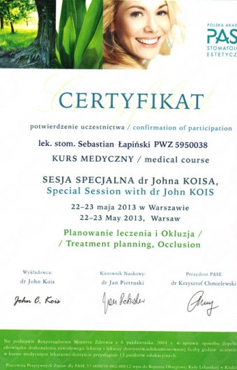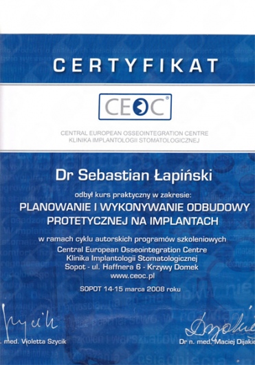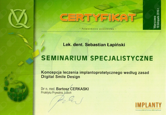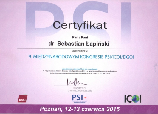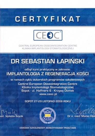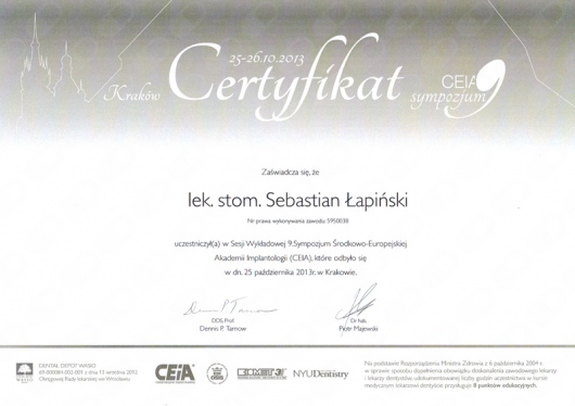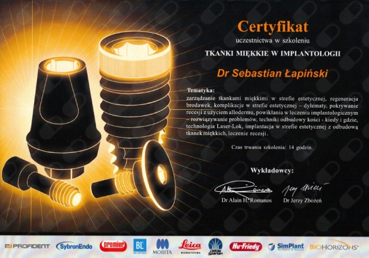 Uczestniczy corocznie w szkoleniach, kursach i sympozjach z zakresu implantologii, chirurgii stomatologicznej, protetyki i stomatologii estetycznej, prowadzonych przez światowe autorytety. Nieustannie dba o najwyższy poziom leczenia pacjentów.