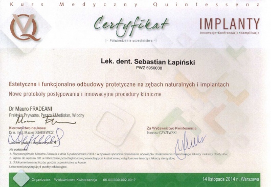 Jaki jest zakres porad oferowanych przez Sebastian Łapiński?Sebastian Łapiński to stomatolog, chirurg, protetyk stomatologiczny. Na podstawie swojego doświadczenia i wykształcenia Sebastian Łapiński oferuje usługi takie jak: korony porcelanowe, implanty, chirurgiczne usuwanie zębów, licówki, konsultacja implantologiczna, mosty, protezy.