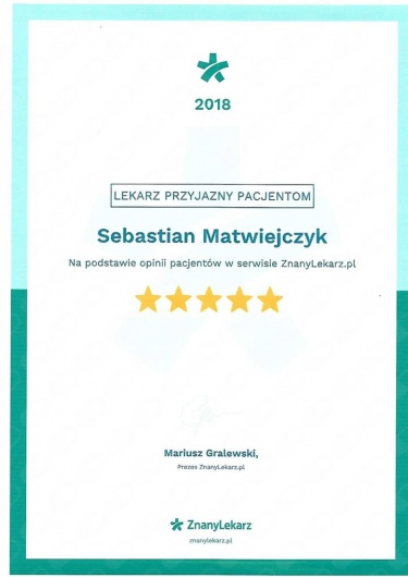 Jak Sebastian Matwiejczyk umawia wizyty?Sebastian Matwiejczyk używa kalendarza ZnanyLekarz, dlatego na stronie widzisz aktualne terminy. Wystarczy, że wybierzesz datę i godzinę, które odpowiadają Ci najbardziej. Umawianie wizyty jest darmowe, a tuż przed terminem wyślemy Ci przypomnienie.