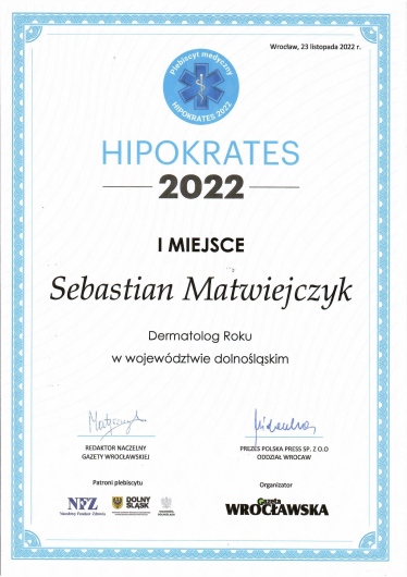 Jaki jest zakres porad oferowanych przez Sebastian Matwiejczyk?Sebastian Matwiejczyk to dermatolog, lekarz wykonujący zabiegi medycyny estetycznej, wenerolog. Na podstawie swojego doświadczenia i wykształcenia Sebastian Matwiejczyk oferuje usługi takie jak: konsultacja dermatologiczna, peeling chemiczny, badanie włosa, Konsultacja z zakresu medycyny estetycznej, Botoks - linie poprzeczne czoła, laseroterapia zmarszczek, laserowe usuwanie zmian naczyniowych, Usuwanie znamion barwnikowych, testy skórne, konsultacja wenerologiczna.