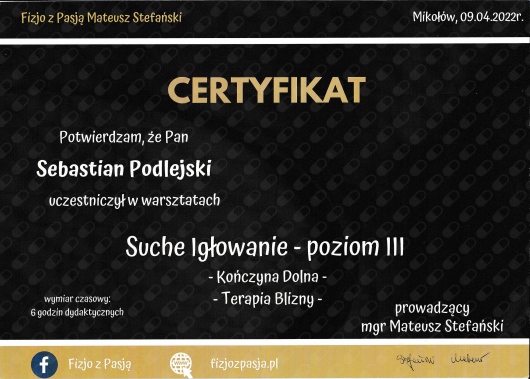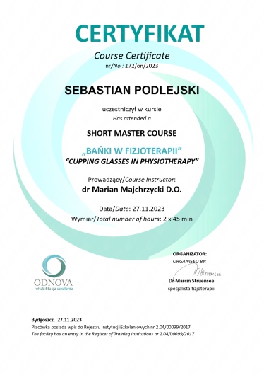 Jaki jest zakres porad oferowanych przez Sebastian Podlejski?Sebastian Podlejski to fizjoterapeuta. Na podstawie swojego doświadczenia i wykształcenia Sebastian Podlejski oferuje usługi takie jak: Fizjoterapia (pierwsza wizyta), Fizjoterapia (kolejna wizyta).