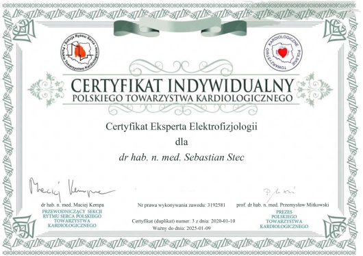 Ekspert Europejskiego Towarzystwa Kardiologicznego (ESC, FESC) i ekspert ablacyjny Sekcji Rytmu Serca Polskiego Towarzystwa Kardiologicznego. Kardiolog "autonomiczny".