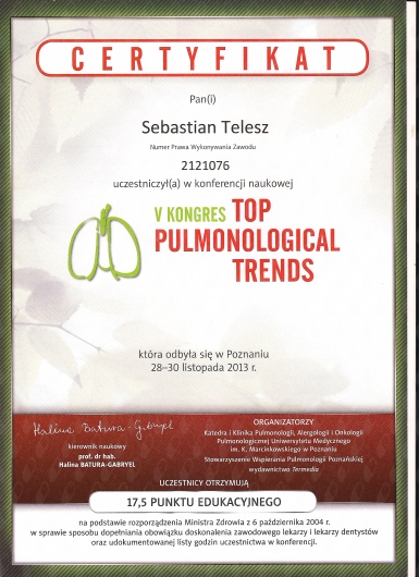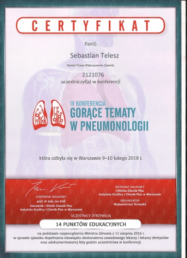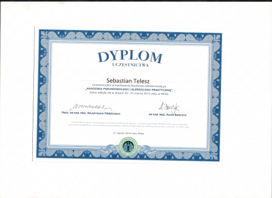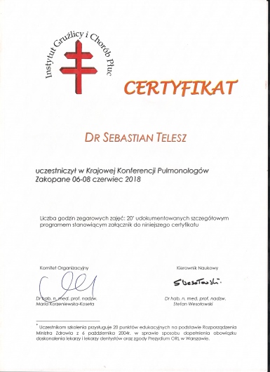 Jaki jest zakres porad oferowanych przez Sebastian Telesz?Sebastian Telesz to pulmonolog, internista. Na podstawie swojego doświadczenia i wykształcenia Sebastian Telesz oferuje usługi takie jak: Konsultacja pulmonologiczna, konsultacja internistyczna, spirometria.