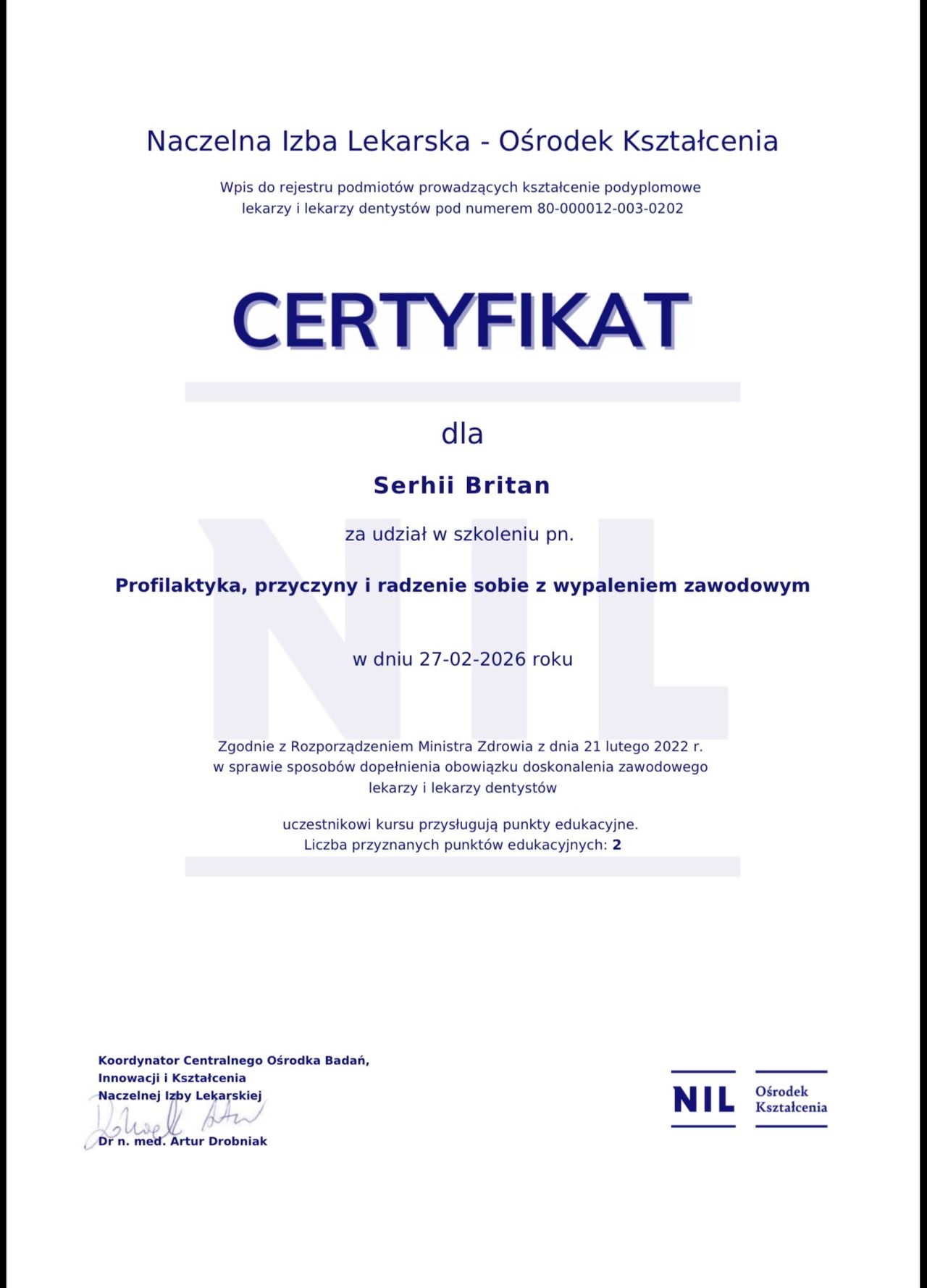 Jakie ubezpieczenia akceptuje Serhii Britan?Serhii Britan nie przyjmuje w ramach ubezpieczenia, tylko w ramach płatnych wizyt prywatnych. W razie wątpliwości zalecamy kontakt ze specjalistą.