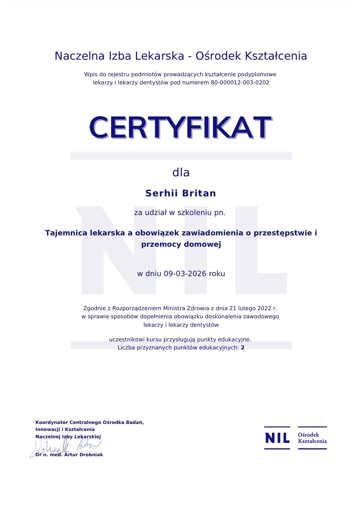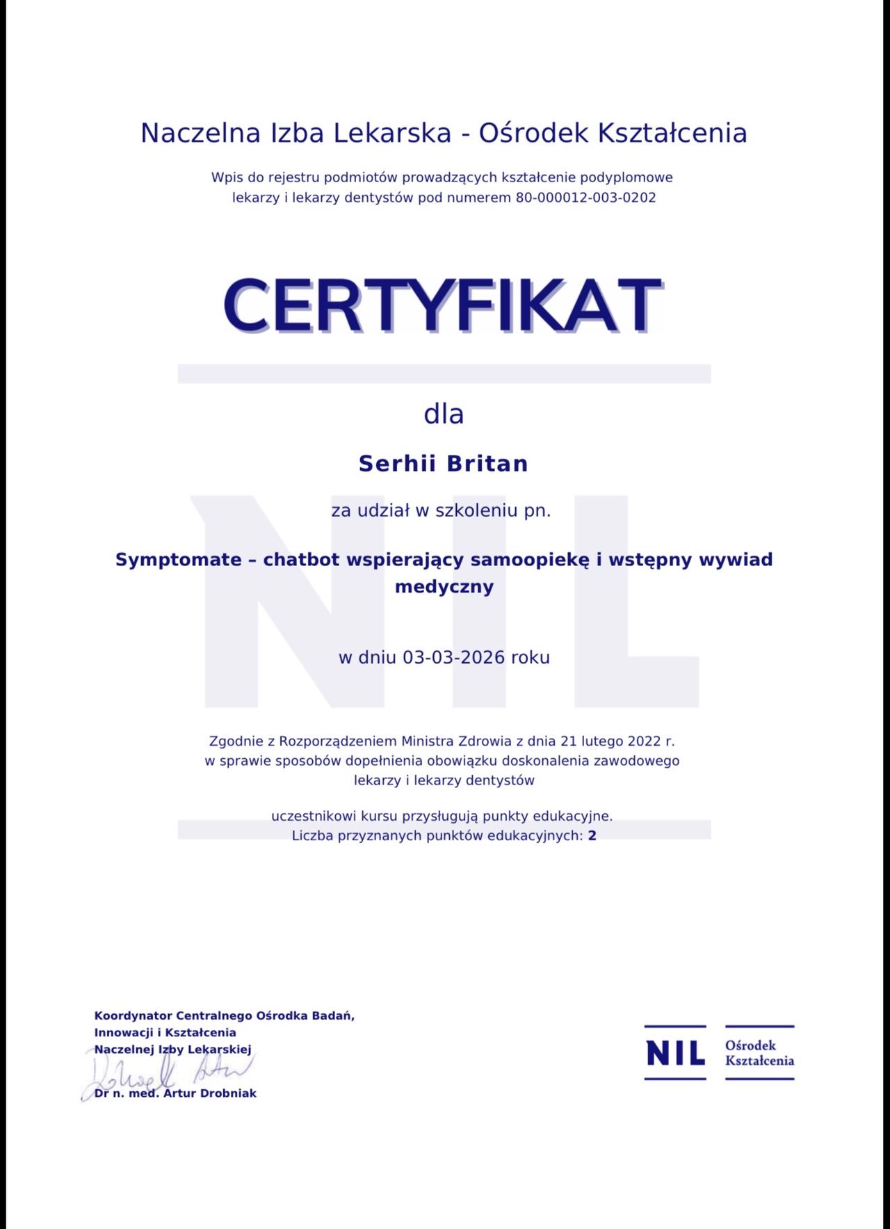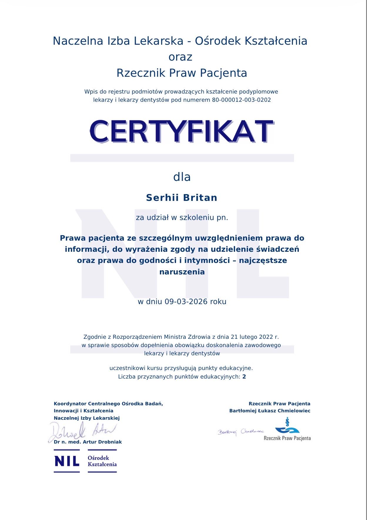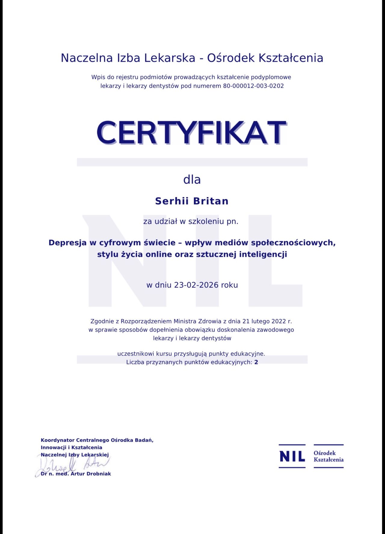 Czy Serhii Britan przyjmuje online, bez konieczności pojawiania się w placówce?Nie, w tym momencie Serhii Britan nie oferuje konsultacji online.