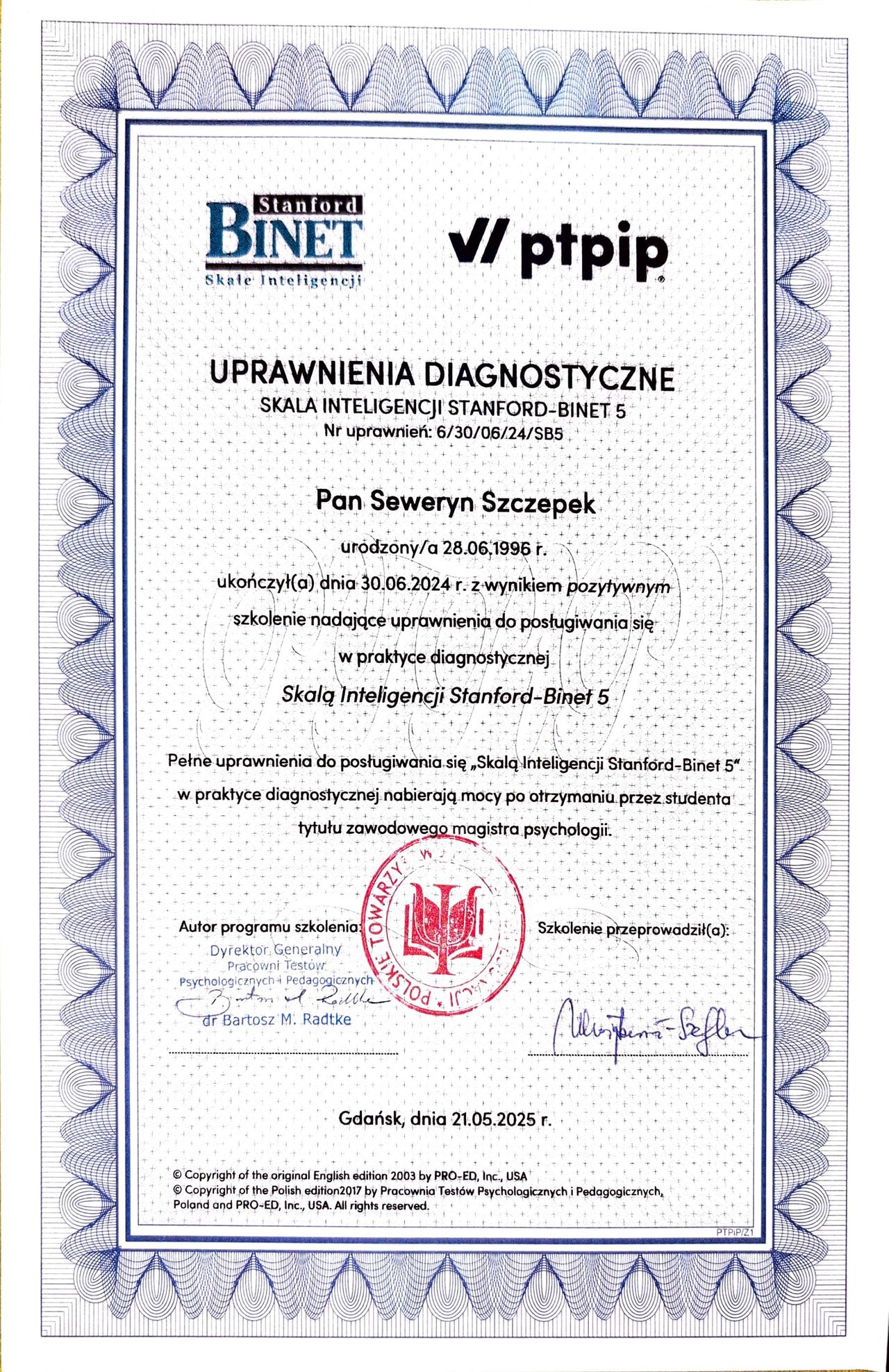 Seweryn Szczepek jest psychologiem, który doświadczenie zawodowe zdobywał w specjalistycznych jednostkach psychiatrycznych, w systemie penitencjarnym, a także w pracy z adolescentami. Doświadczenie w pracy z młodzieżą szczególnie poszerza jego kompetencje o umiejętność uważnego reagowania na dynamiczne potrzeby rozwojowe nastolatków funkcjonujących w wymagających realiach współczesnego świata. Dodatkowo posiada doświadczenie w pracy z osobami neuroatypowymi, co pozwala mu dostosowywać podejście terapeutyczne do indywidualnych sposobów funkcjonowania i percepcji pacjentów. Kontakt z różnorodnymi środowiskami pozwolił mu rozwinąć wszechstronną perspektywę kliniczną, a także wyjątkową wrażliwość na indywidualne potrzeby i tempo pracy każdego pacjenta. Dzięki temu wspiera dorosłych i młodzież w świadomym rozwoju, pomagając im odnaleźć spokój, pewność siebie i strategie radzenia sobie w wymagających okresach życia.