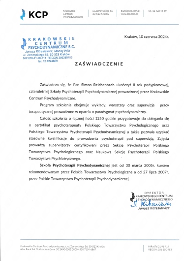 Jaki jest zakres porad oferowanych przez Simon Reichenbach?Simon Reichenbach to psychoterapeuta, psycholog. Na podstawie swojego doświadczenia i wykształcenia Simon Reichenbach oferuje usługi takie jak: konsultacja psychoterapeutyczna (pierwsza wizyta), konsultacja psychologiczna (pierwsza wizyta), Indywidualna konsultacja psychoterapeutyczna.