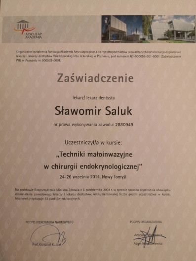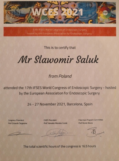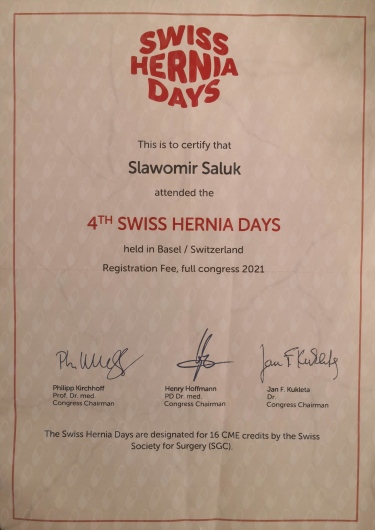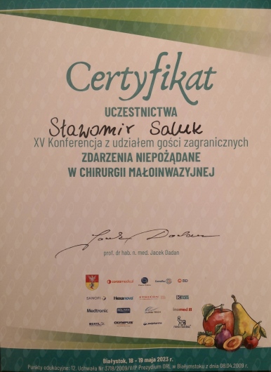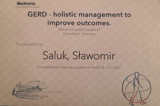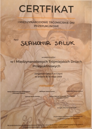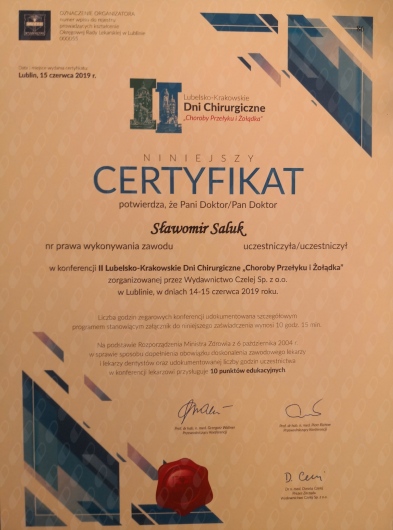 Miałem kilka podejść do operacji dużej przepukliny rozworu przełykowego. Dopiero Pan Doktor Saluk objął mnie profesjonalną opieką i wykonał operację w Kartuzach. Jestem kilka dni po zabiegu laparoskopowej plastyki przepukliny roztworu przełykowego z wszczepieniem siatki i przeprowadzonej fundoplikacji a już mam ulgę i mogę spać bez duszenia się treścią pokarmową. Pan Doktor czuwał nademną zarówno przed jak i po operacji i na bieżąco informował mnie o przebiegającym leczeniu dzięki temu spokojniej przygotowałem się do tego zabiegu. Polecam Pana Doktora Sławomira Saluka za profesjonalizm oraz ciepłe podejście do pacjenta.