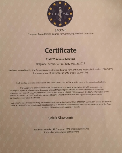 Z całego serca i duszy polecam Pana dr Saluka. Jest lekarzem profesjonalistą, wykazuje ogromne zaangażowanie i troskę w uzdrowieniu pacjenta z jego dolegliwości. Wizyta u Pana dr to także wspaniała forma dialogu, wysłuchuje pacjenta, nie lekceważy żadnej informacji uzyskanej z wywiadu. Posiada bardzo dużą wiedzę, doświadczenie, profesjonalizm, fachowość, dokładność oraz otwarte serce na pomoc, wskazał kolejne badanie, które muszę wykonać przed operacją przepukliny roztworu przełykowego. Z całego serca polecam Pana doktora Sławomira Saluka.