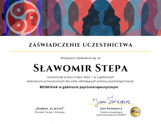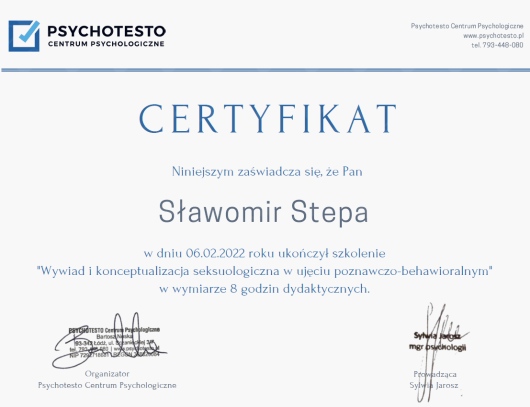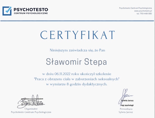 W pracy kieruję się kodeksem etycznym Polskiego Towarzystwa Psychoterapeutycznego oraz Polskiego Towarzystwa Seksuologicznego.