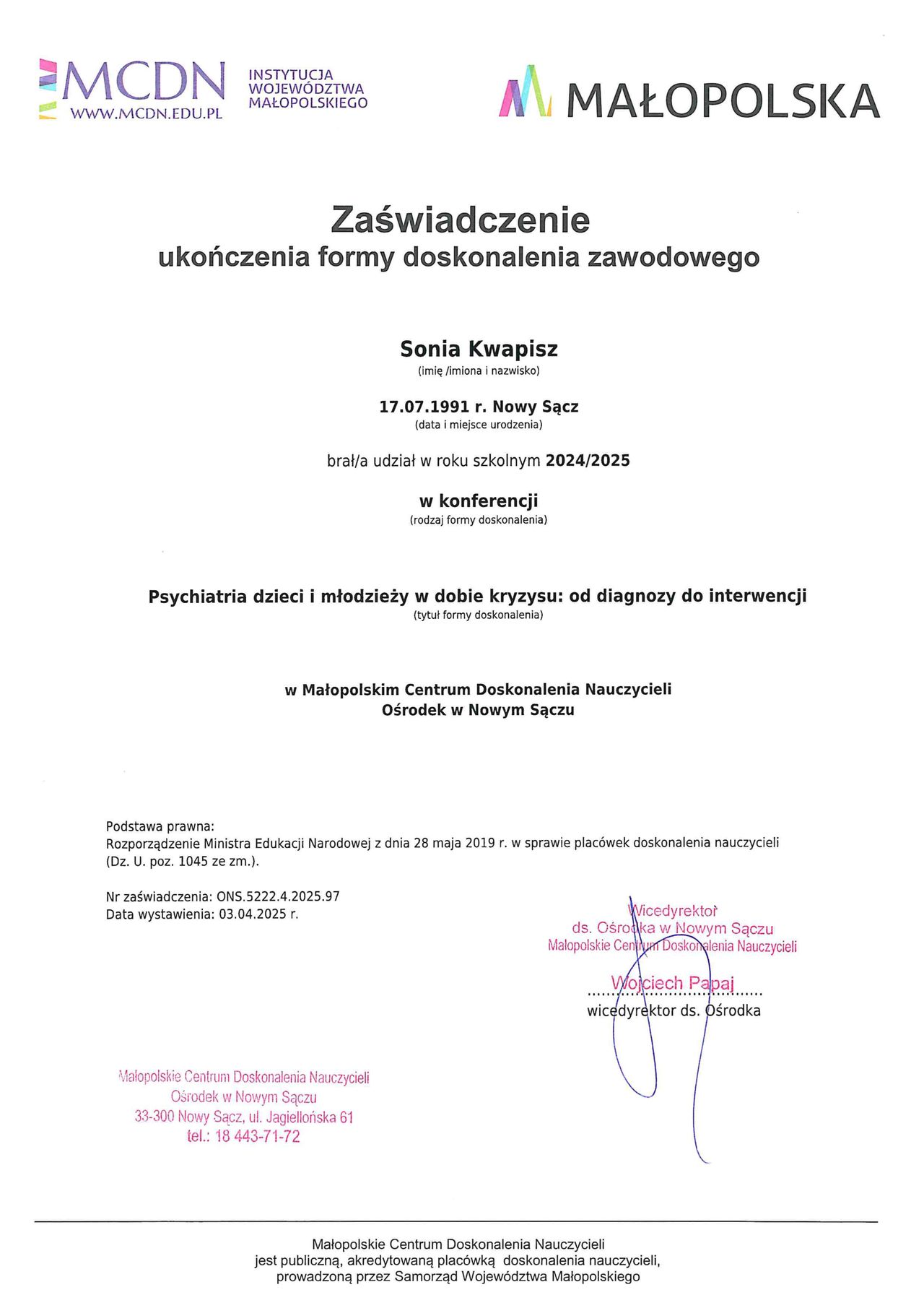Czy Sonia Kwapisz przyjmuje online, bez konieczności pojawiania się w placówce?Nie, w tym momencie Sonia Kwapisz nie oferuje konsultacji online.