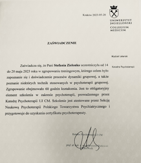 Jestem psychologiem oraz psychoterapeutą. Ukończyłam całościowy kurs psychoterapeutyczny organizowany przez Katedrę Psychoterapii Collegium Medicum Uniwersytetu Jagiellońskiego, który posiada akredytację Polskiego Towarzystwa Psychiatrycznego. Pracuję z dorosłymi opierając się na nurcie integracyjnym oraz psychodynamicznym wykorzystując techniki wywodzące się z różnych nurtów. Wykształcenie psychologiczne zdobyłam na Uniwersytecie Marii Curie-Skłodowskiej w Lublinie oraz Uniwersytecie Pedagogicznym w Krakowie. Jestem członkiem Polskiego Towarzystwa Psychiatrycznego.