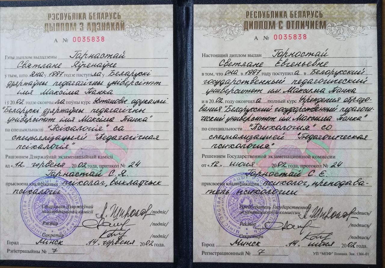 Jaki jest zakres porad oferowanych przez Sviatlana Harnastai?Sviatlana Harnastai to psycholog, psychoterapeuta. Na podstawie swojego doświadczenia i wykształcenia Sviatlana Harnastai oferuje usługi takie jak: psychoterapia online, Psychoterapia psychoanalityczna.