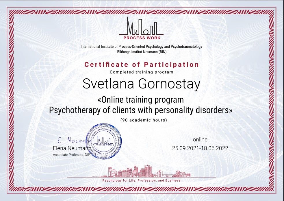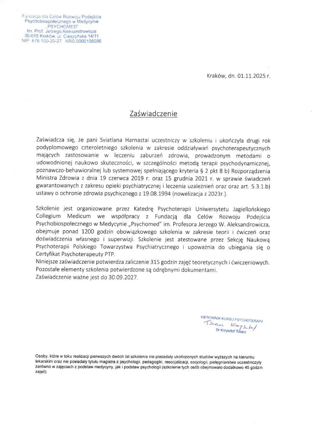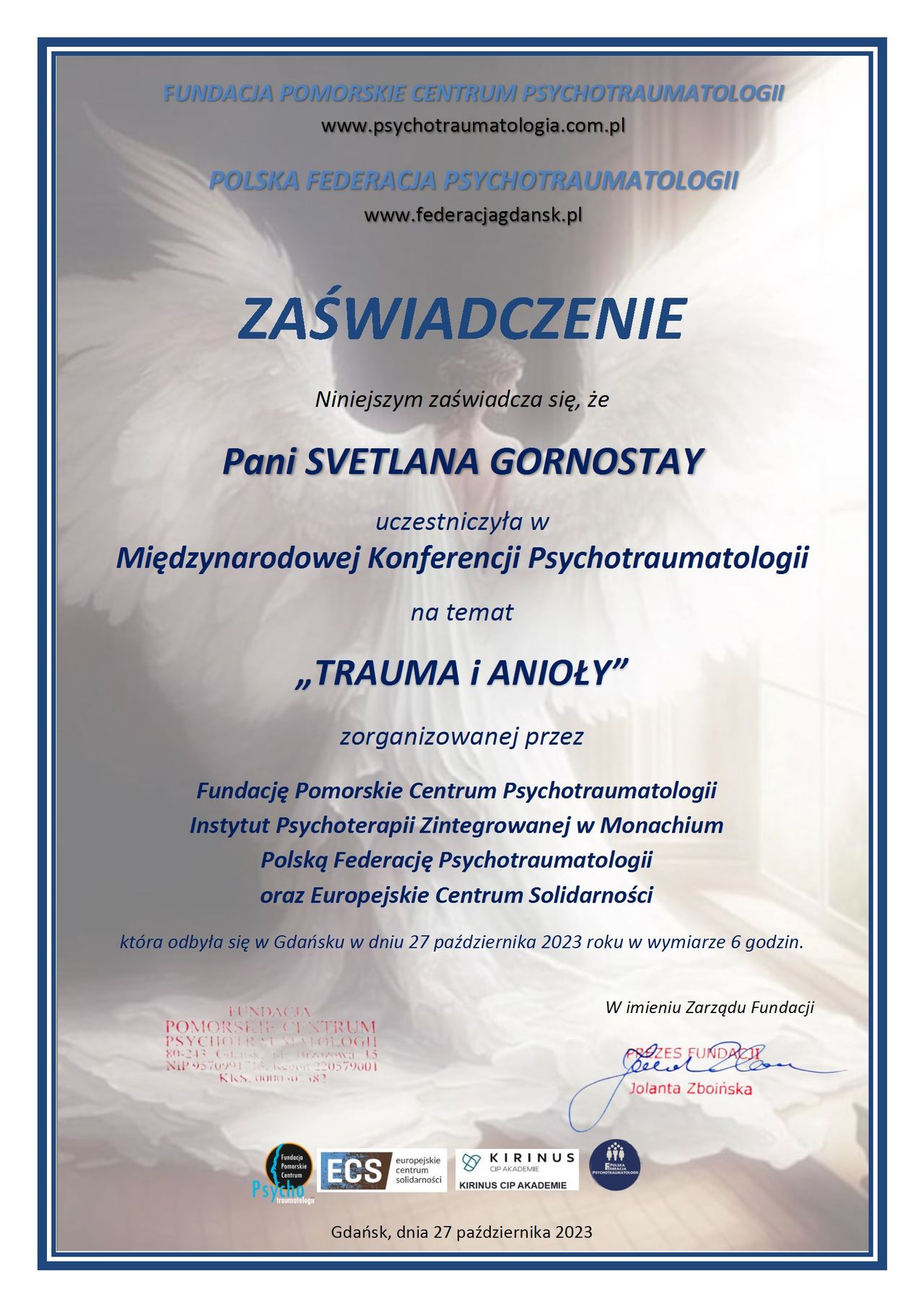 Zostałam zaakceptowana jako kandydatka w szkoleniu analitycznym Międzynarodowego Towarzystwa Psychologii Analitycznej (IAAP: International Association for Analytical Psychology) i przyjęta na indywidualną ścieżkę szkoleniową IAAP. W kwietniu 2025 roku z powodzeniem zdałam Intermediate Exam, który jest ostatnim etapem do uzyskania tytułu psychoanalityczki jungowskiej.