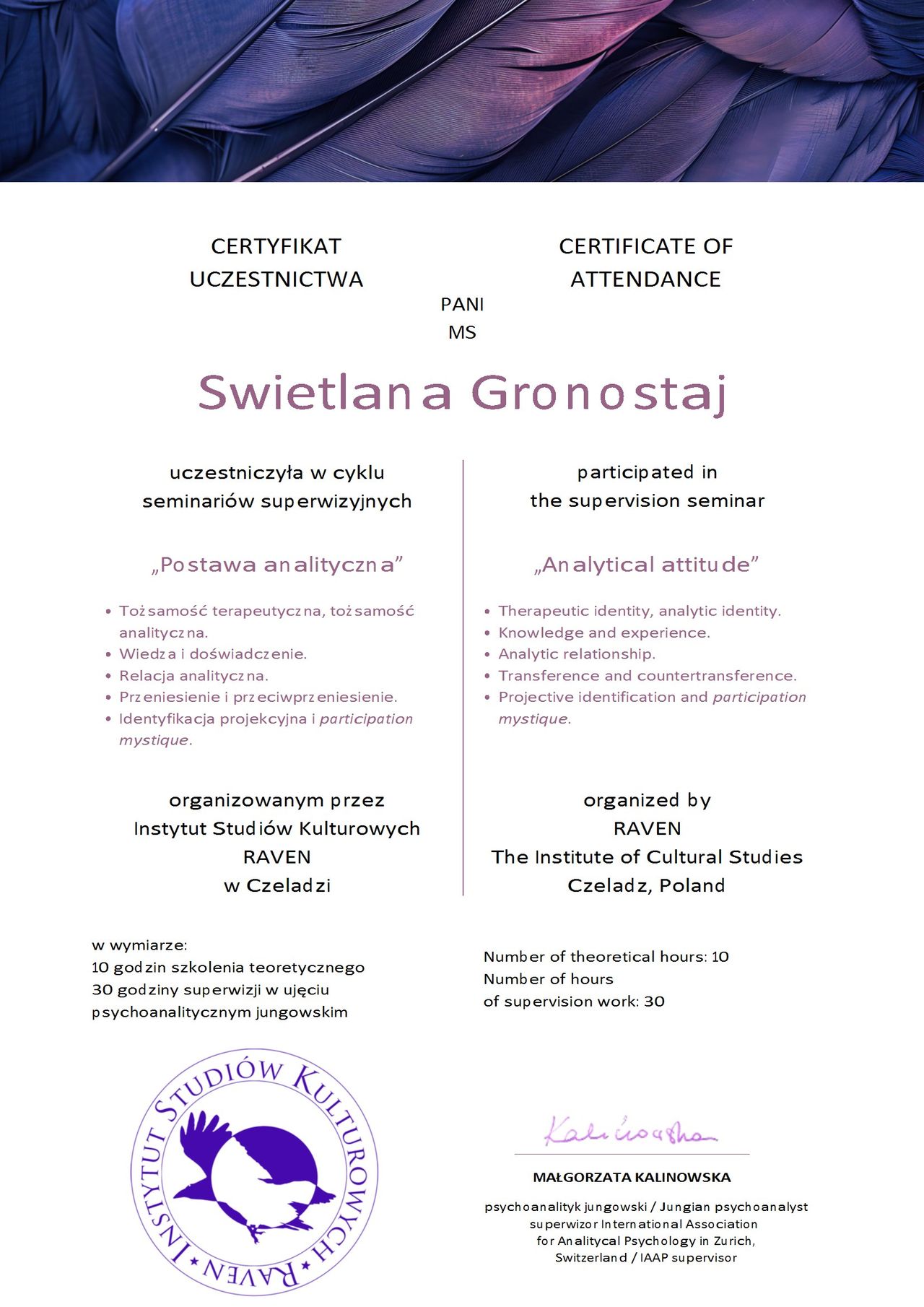 Jestem w trakcie analizy własnej u jungowskiego analityka IAAP. Regularnie korzystam z superwizji prowadzonej przez jungowskich analityków IAAP w Polsce i za granicą.