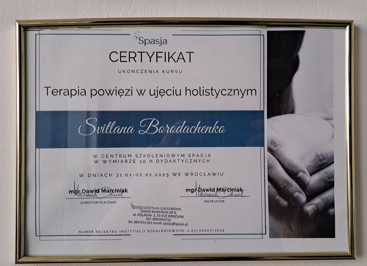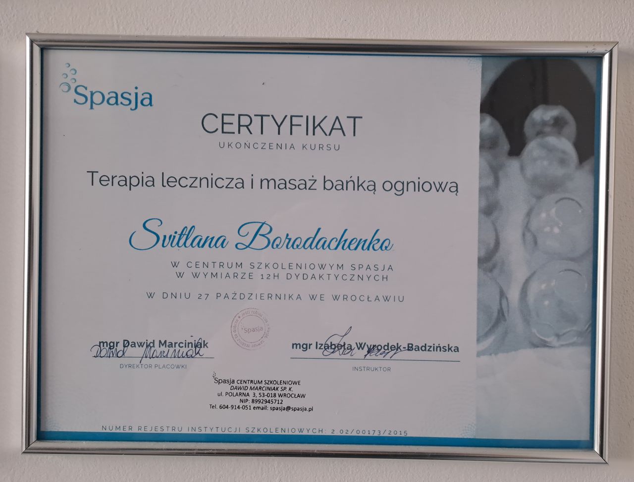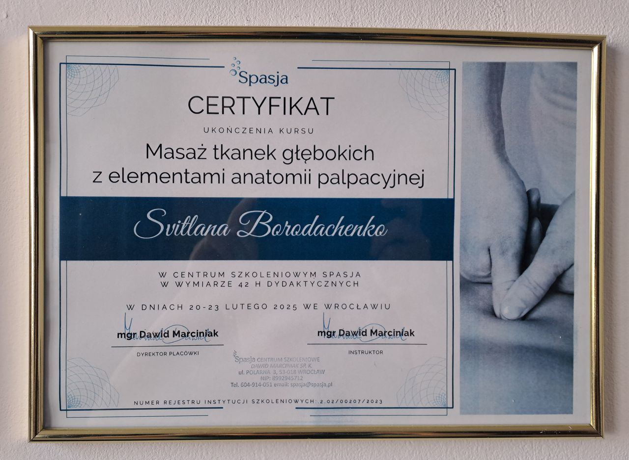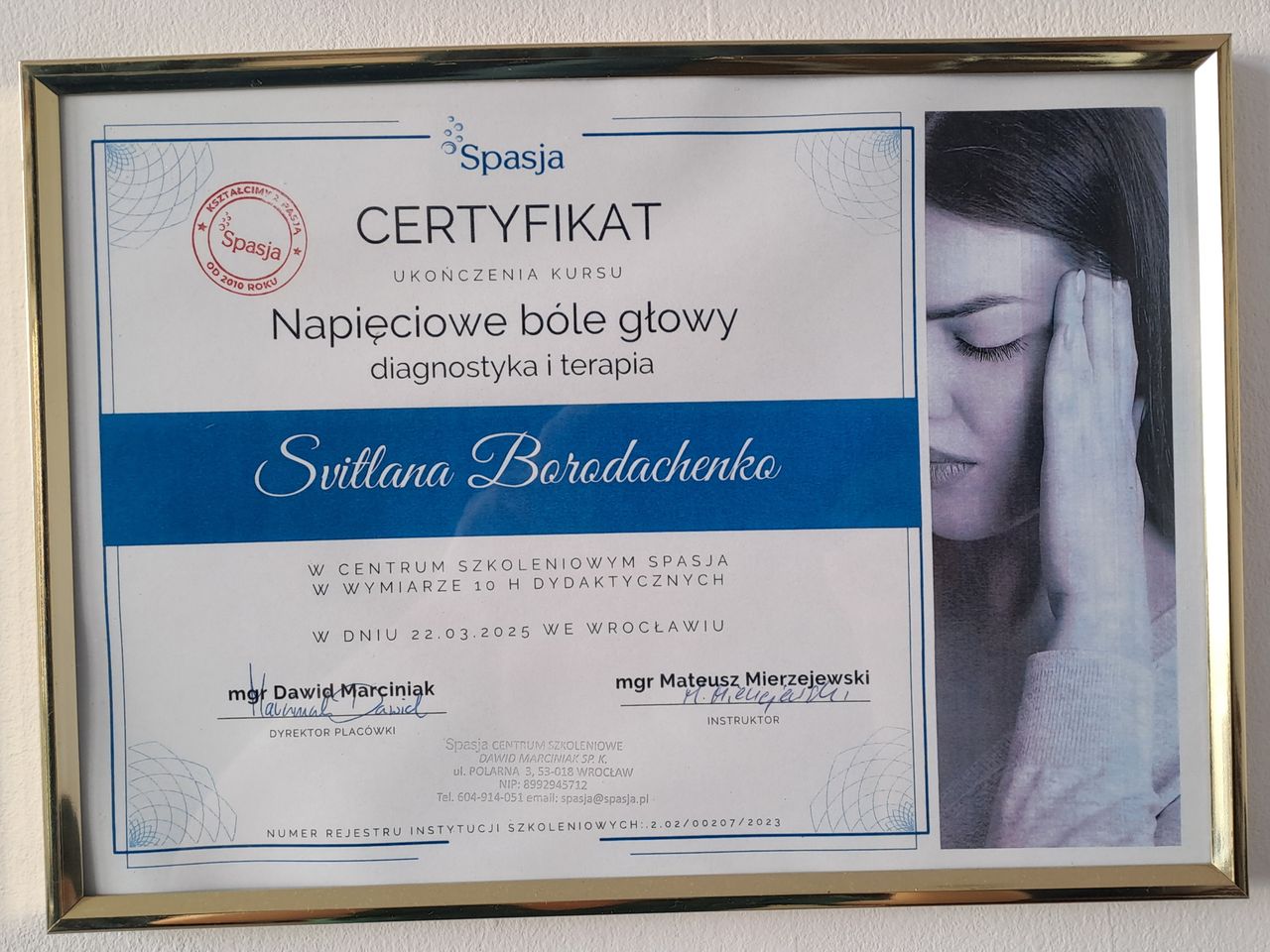 Svitlana Borodachenko – Technik masażysta medyczny Jestem dyplomowanym technikiem masażystą, absolwentką Szkoły Medycznej w Poznaniu.