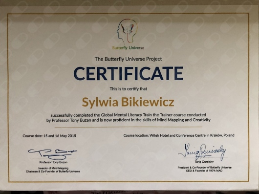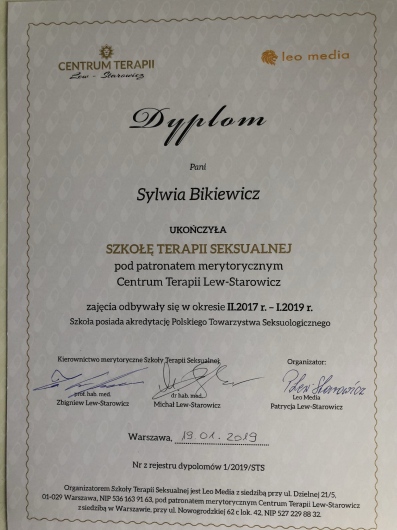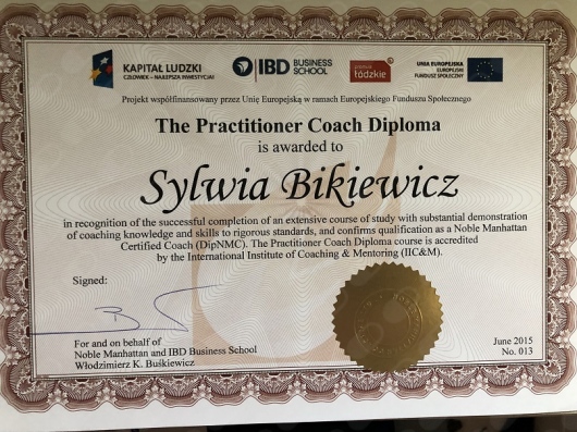 Absolwentka Międzynarodowej największej i najstarszej w Europie szkoły coachingu Noble Manhattan Coaching. Absolwentka szkoły trenerów biznesu oraz trenerów umiejętności psychospołecznych (19 Licencja w Polsce metody "Open by horses"). Ukończyła calosciowe podyplomowe szkolenie kompetencji w zakresie udzielania pomocy psychologicznej. Ukonczyla szereg kursow i szkolen z zakresu psychoterapii, psychoterapii zaburzeń seksualnych doskonaląc swój warsztat i podnosząc kwalifikacje.