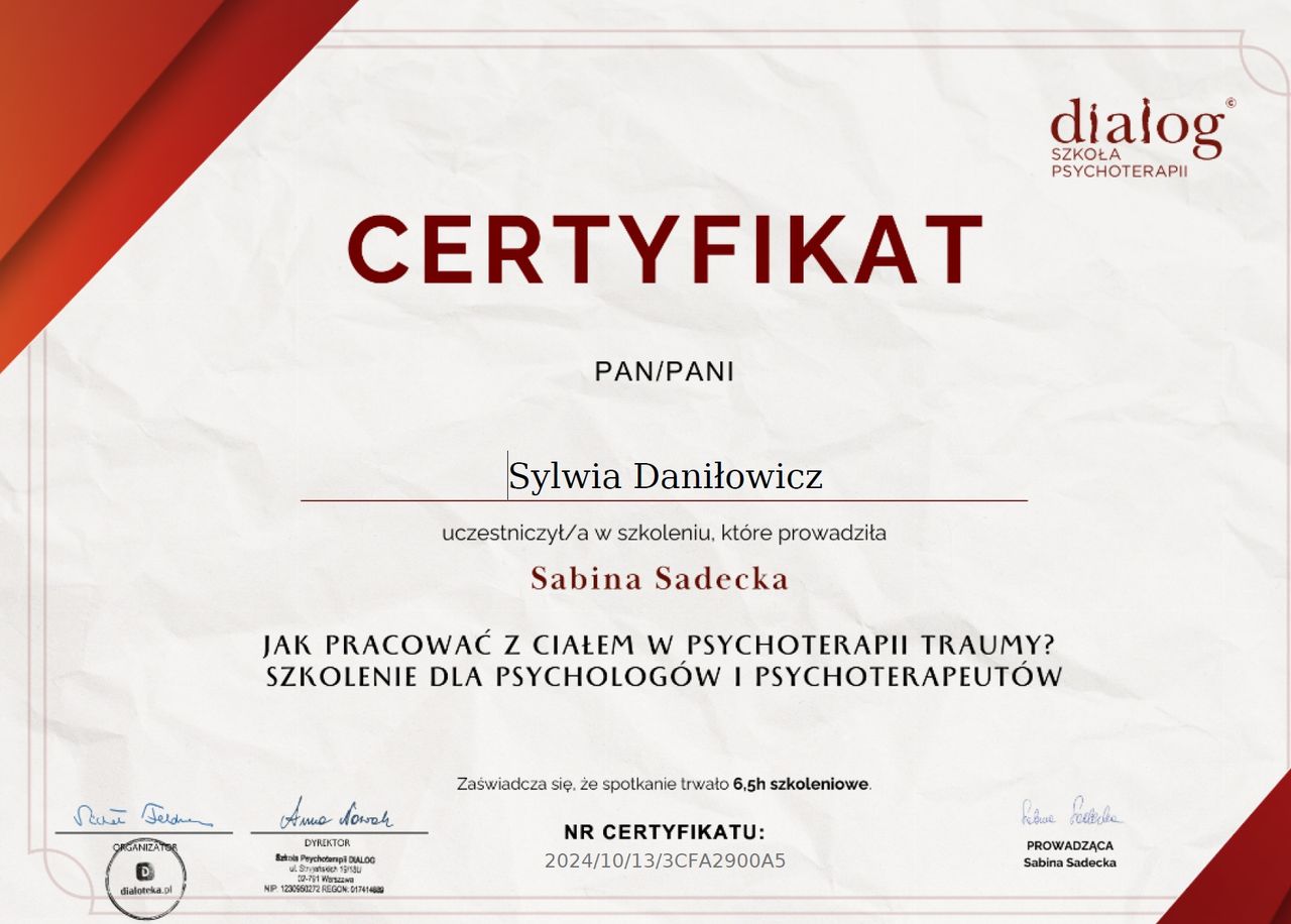 Byłem w procesie terapeutycznym u Pani Sylwii przez rok, w okresie 10.2023-09.2024. Z czystym sercem mogę polecić współpracę! Dzięki terapii przepracowałem bardzo istotne dla mnie tematy a zaangażowanie Pani Sylwii zdecydowanie ten proces ułatwiało. Doceniam bardzo zaangażowanie oraz zdolność do dostosowania metod pracy w zależności od stanu i nastroju. Na ogromny plus zasługuje również możliwość zmiany trybu na online w razie potrzeby, nawet w tzw "ostatniej chwili". Dzięki wsparciu uzyskanemu w trakcie spotkań żyje mi się zdecydowanie lepiej! Pani Sylwia jest wspaniałą specjalistką :)