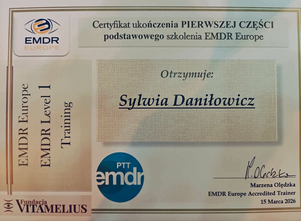 Ukończyłam 4-letnią Profesjonalną Szkołę Psychoterapii Integracyjnej i uzyskałam dyplom Całościowego Programu Szkolenia Psychoterapeutów (łącznie ze stażem klinicznym i terapią własną). Poszerzam swoje kompetencje w kierunku psychotraumatologii oraz technik EMDR.