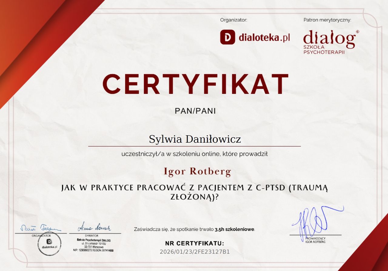 Pani Sylwia jest nie tylko zaangażowanym i wnikliwym specjalistą, ale też bardzo empatyczną osobą, która podeprze w odpowiednim momencie. Do tego skutecznie popycha w stronę samodzielnej pracy i pochylania się nad swoimi emocjami na co dzień. Rok cyklicznych spotkań pomógł mi inaczej spojrzeć na niektóre sprawy i nie walczyć aż tak ze sobą i swoją złością. Dziękuję!