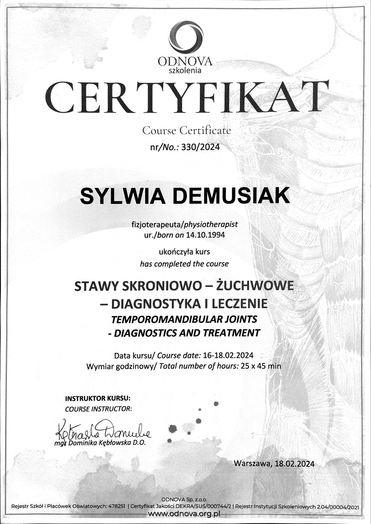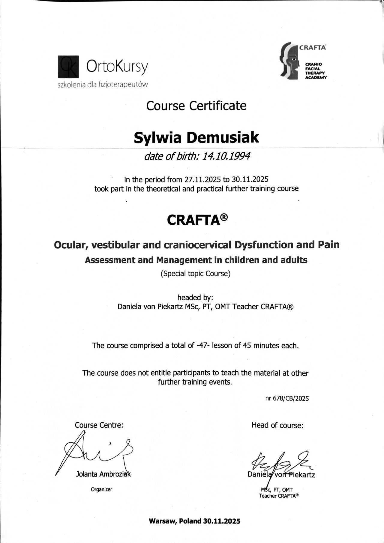 Specjalizuję się w terapii stawów skroniowo-żuchwowych (TMJ), oferując kompleksową diagnostykę funkcjonalną oraz indywidualnie dopasowane leczenie zaburzeń układu stomatognatycznego. Pracuję z pacjentami doświadczającymi dysfunkcji w obszarze czaszkowo-twarzowym, czaszkowo-szyjnym i czaszkowo-żuchwowym, łącząc podejście terapeutyczne z nowoczesną wiedzą z zakresu fizjoterapii stomatologicznej. Systematycznie rozwijam i poszerzam swoje kompetencje aby móc skutecznie pomagać swoim pacjentom.