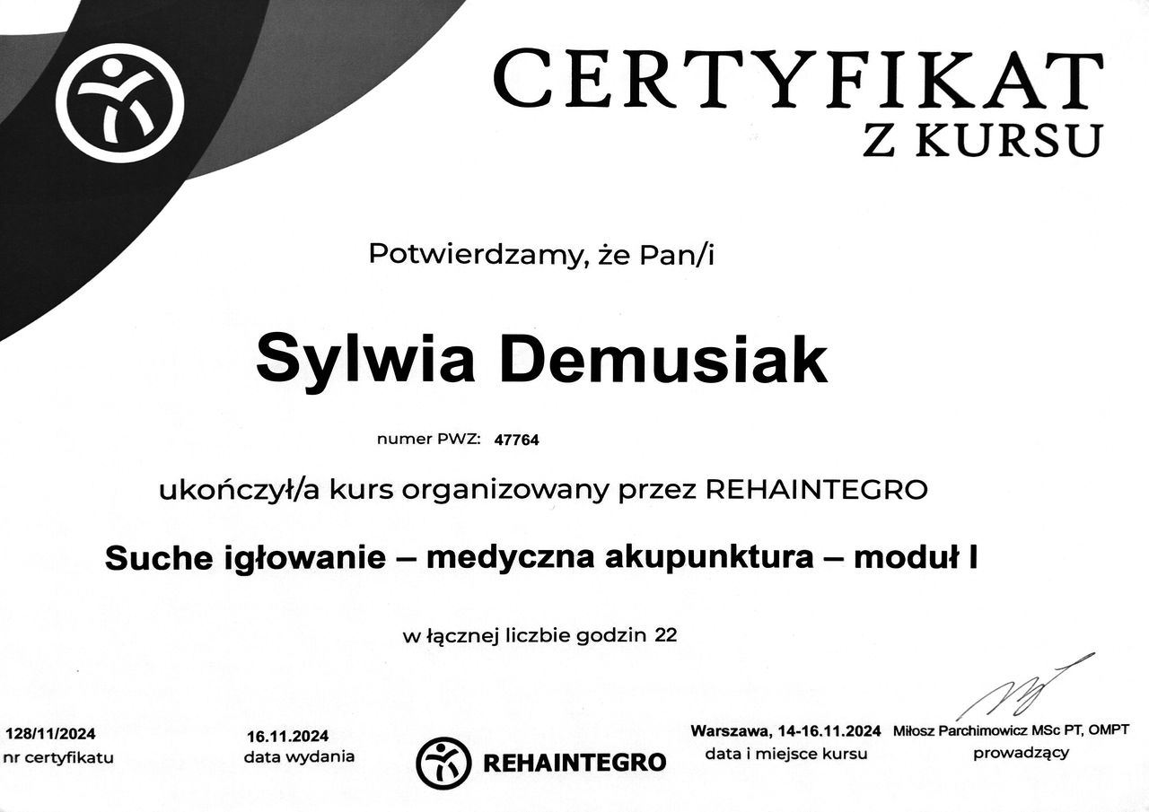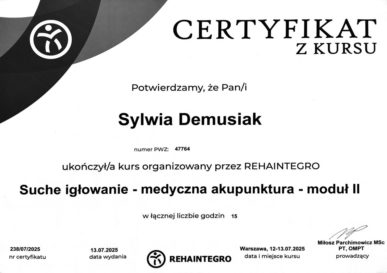 Jaki jest zakres porad oferowanych przez Sylwia Demusiak?Sylwia Demusiak to fizjoterapeuta. Na podstawie swojego doświadczenia i wykształcenia Sylwia Demusiak oferuje usługi takie jak: elektroterapia, fizjoterapia, fizykoterapia, konsultacja fizjoterapeutyczna, rehabilitacja pourazowa, kinesiotaping, terapia stawów skroniowo-żuchwowych, badanie i fizjoterapia funkcjonalna w uszkodzeniach stawu kolanowego i barkowego, Dry Needling suche igłowanie, Stan ostry - Fizjoterapia.