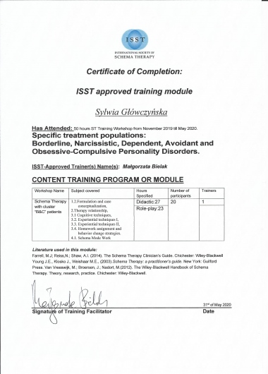 Obecnie poszerzam swoje kompetencje zawodowe, biorąc udział w długoterminowym szkoleniu do uzyskania certyfikatu terapeuty schematów. Regularnie korzystam z superwizji swojej pracy.