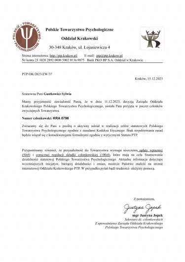 Należę do Polskiego Towarzystwa Psychologicznego. Numer członkowski: KRA 0796