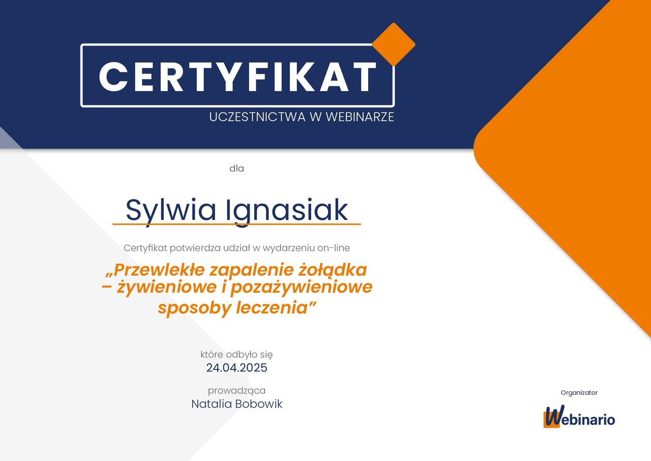 Otrzymałam komplet informacji dotyczących diety i suplementacji w zgłoszonych przeze mnie problemach zdrowotnych. Pani Sylwia zmotywowała mnie do poszerzenia diagnostyki by dokładniej wyjaśnić przyczynę dolegliwości.