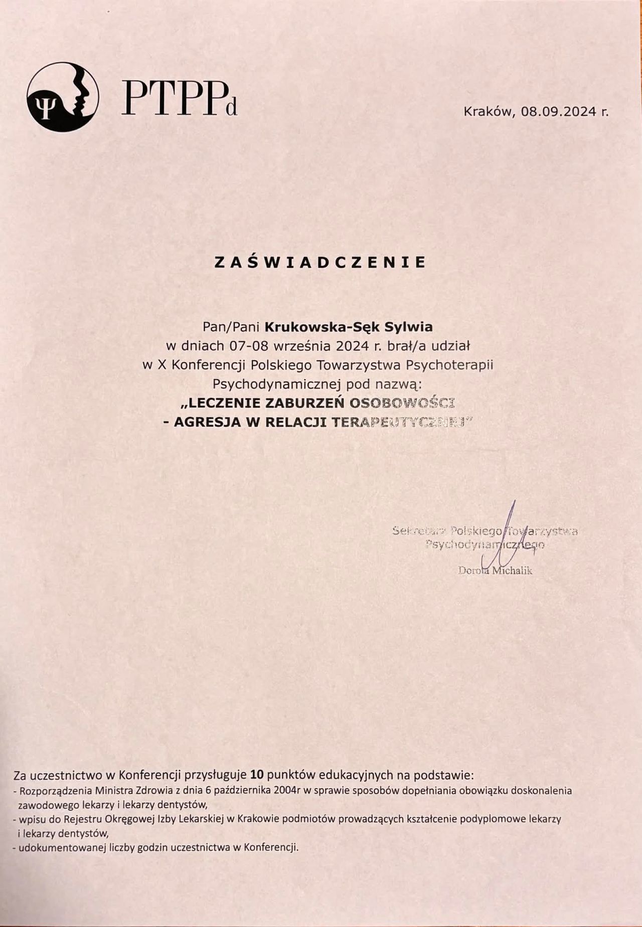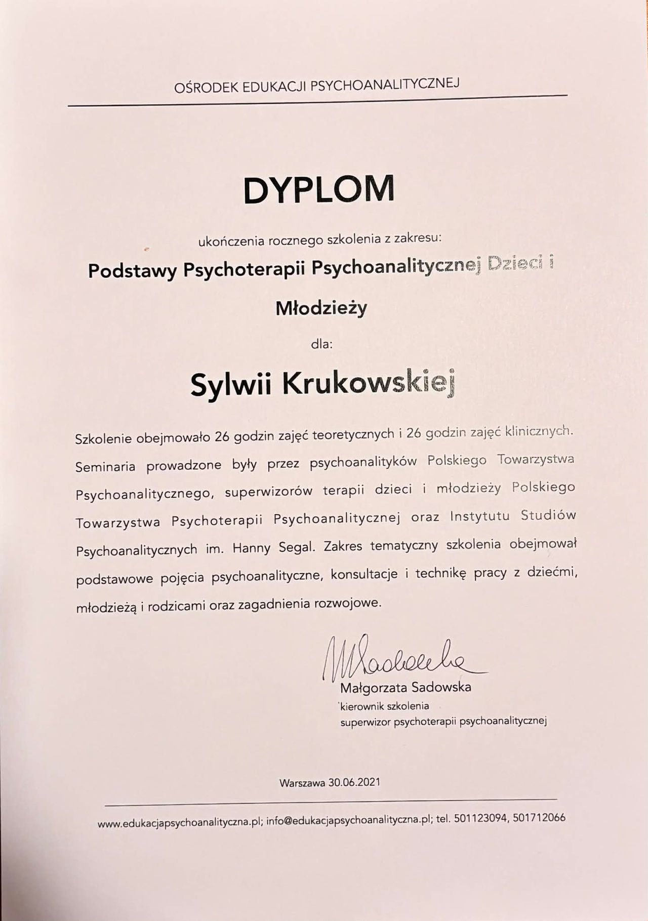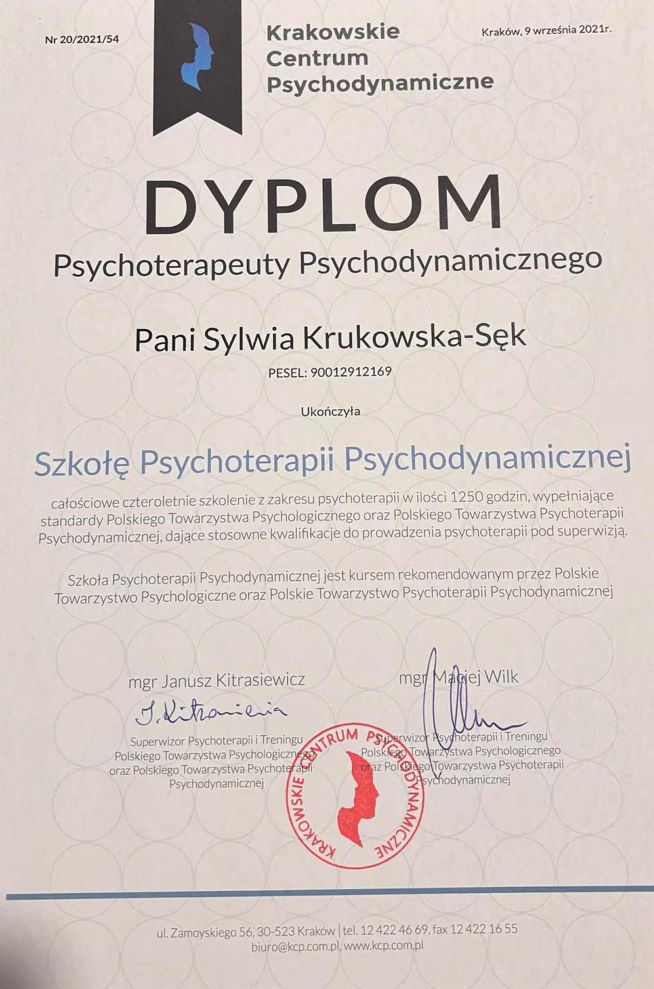 Ukończyłam również 4-letnią szkołę psychoterapii w Krakowskim Centrum Psychodynamicznym, rekomendowaną przez: