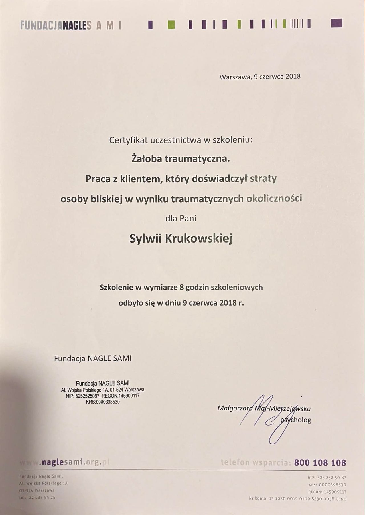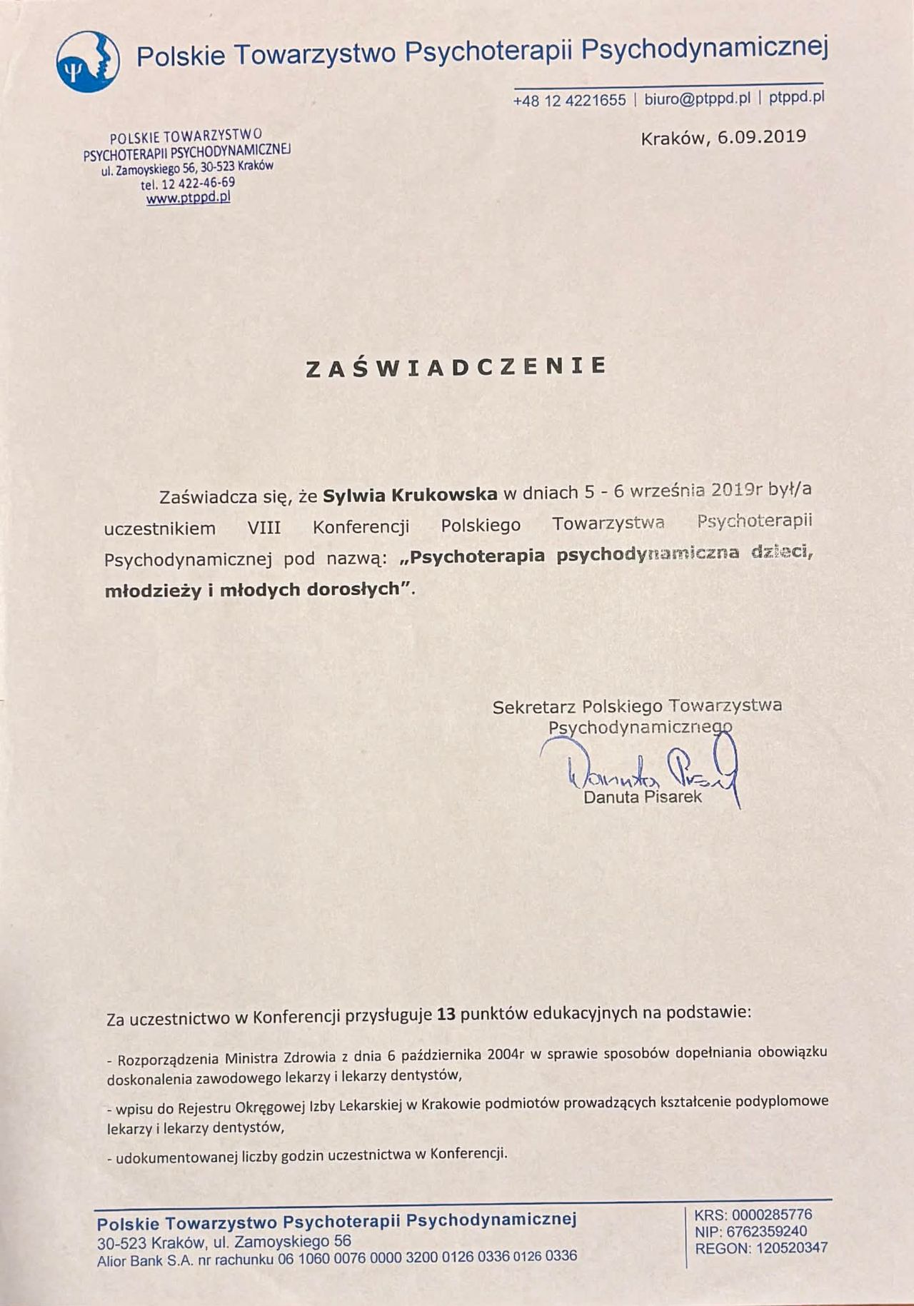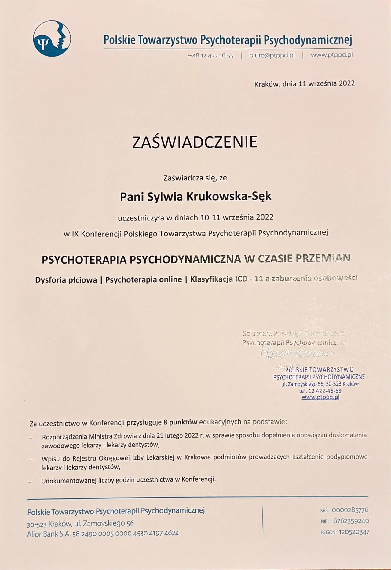 Ukończyłam również 4-letnią szkołę psychoterapii w Krakowskim Centrum Psychodynamicznym, rekomendowaną przez: