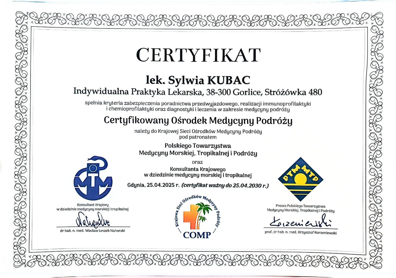 Interesuję się też medycyną podróży. Ukończyłam studia podyplomowe CMKP UJ z tego zakresu. Posiadam certyfikat zawodowy. Konsultuję pacjentów w każdym wieku, którzy chcą przygotować się do wyjazdu, jak i tych, którzy wracają z niepokojącymi objawami.