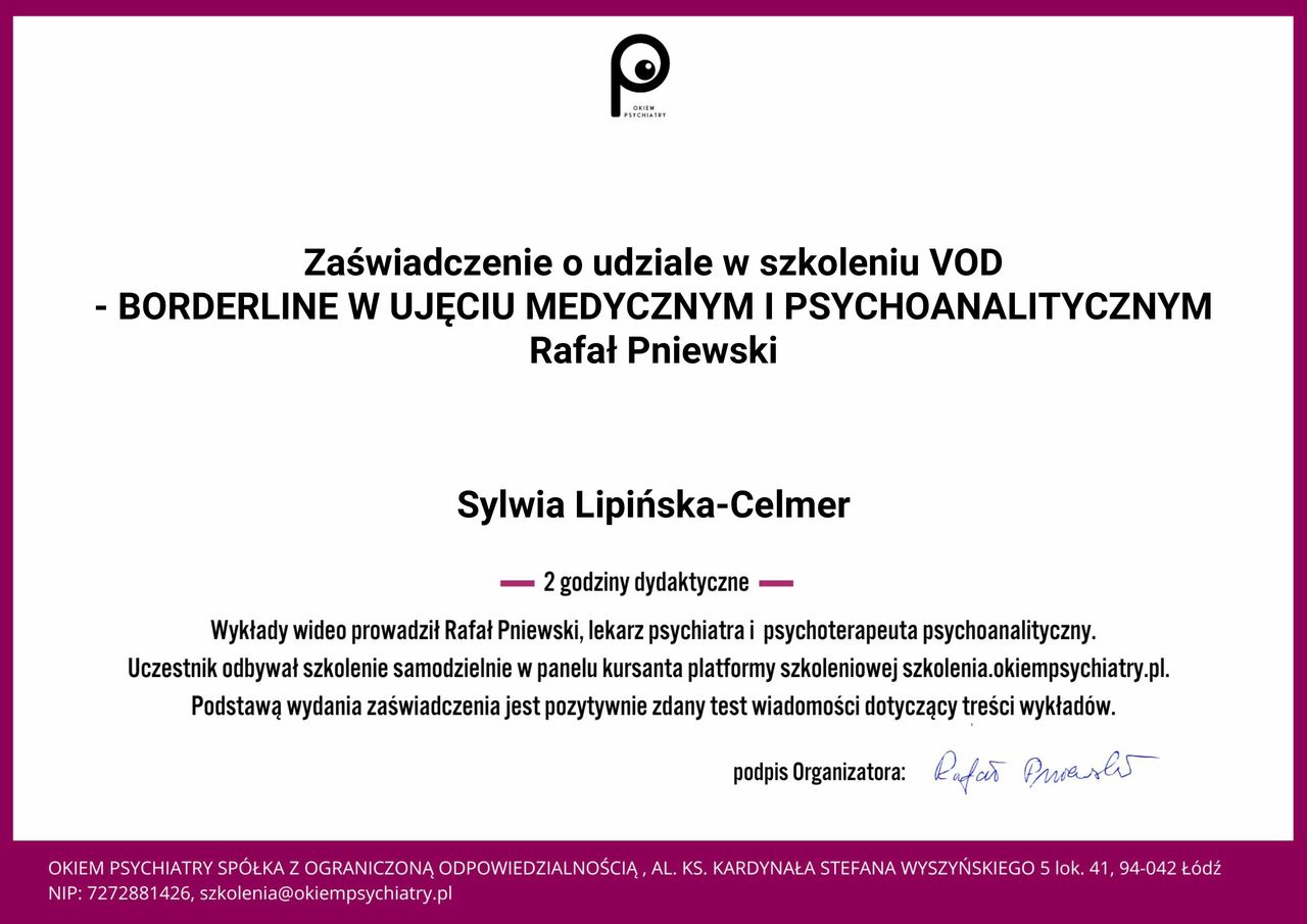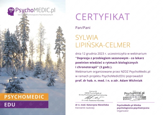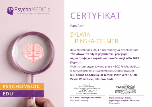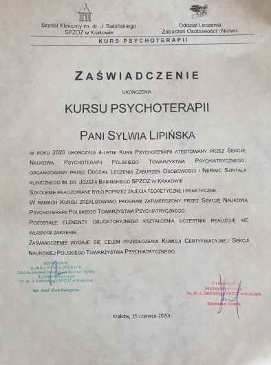 W swojej pracy i w kontakcie z pacjentem korzystam ze zdobytego doświadczenia zarówno jako lekarza psychiatry i psychoterapeuty. Staram się wspólnie z pacjentem wyklarować i zrozumieć jego problem oraz polecić najskuteczniejszą pomoc. Preferuję holistyczne podejście do zaburzeń psychicznych. Podczas wizyty chętnie korzystam z elementów psychoterapii i psychoedukacji jednocześnie zapewniając adekwatną farmakoterapię. Jestem absolwentką Wydziału Lekarskiego Gdańskiego Uniwersytetu Medycznego. W 2016r uzyskałam dyplom lekarza. Następnie w 2017r rozpoczęłam szkolenie specjalizacyjne z psychiatrii w Szpitalu dla Nerwowo i Psychicznie Chorych w Starogardzie Gdańskim. W marcu 2022r zdałam Państwowy Egzamin Specjalizacyjny z psychiatrii. Dyplom specjalisty uzyskałam 15.11.2022. Doświadczenie zawodowe zdobywałam w wielu oddziałach psychiatrycznych (ogólnopsychiatrycznym, leczenia uzależnień, sądowym), a także w poradniach zdrowia psychicznego (Tczew, Starogard Gdański, Chojnice), domu pomocy społecznej oraz w trakcie wielu kursów i konferencji. W czerwcu 2020 roku ukończyłam 4 letnie szkolenie do certyfikatu psychoterapeuty prowadzone przez Oddział Leczenia Zaburzeń Osobowości i Nerwic Szpitala J. Babińskiego w Krakowie akredytowane przez sekcję naukową Polskiego Towarzystwa Psychiatrycznego oraz Polskie Towarzystwo Psychologiczne. Psychoterapię prowadzę w nurcie psychoanalitycznym, spotkania odbywają się 2 x w tygodniu.