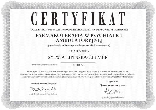 W razie braku kalendarza na ZL proszę o kontakt telefoniczny z wybraną placówką. W celu umożliwienia jak najlepszej jakości usług proszę o przychodzenie na regularne wizyty w wybranym przez Państwa miejscu. Pacjentów z Gdyni zapraszam do Sono Venae Wesołowscy. Pacjentów z Gdańska do Pomorskiego Centrum Psychiatrii przy ul. Śniadeckich (w razie braku terminów w kalendarzu proszę o kontakt telefoniczny). Pacjentów z Chojnic zapraszam do Mental Medica: mentalmedica.com.pl