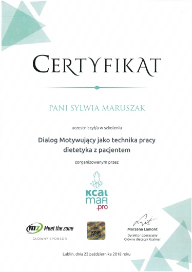 Od dłuższego czasu pracuje z powodzeniem z pacjentami, pomagając im w zmianie nawyków żywieniowych. W swojej pracy stawiam przede wszystkim na indywidualne podejście, wsparcie i edukację żywieniową, tak, aby za dieto terapią szła zmiana stylu życia pacjenta. Dietetyka od zawsze była moją pasją. Jestem przekonana, że prawidłowo dobrana dieto terapia w wielu przypadkach „potrafi zdziałać cuda”