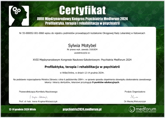 Uczestnictwo w XVIII Miedzynarodowym Kongresie Naukowo-Szkoleniowym: Psychiatria Medforum 2024,