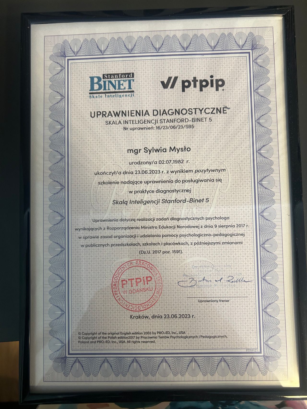 Wykonuje specjalistyczny test Stanford Binet 5, który pozwala ocenić poziom intelektualny badanego oraz jego zdolności poznawcze.