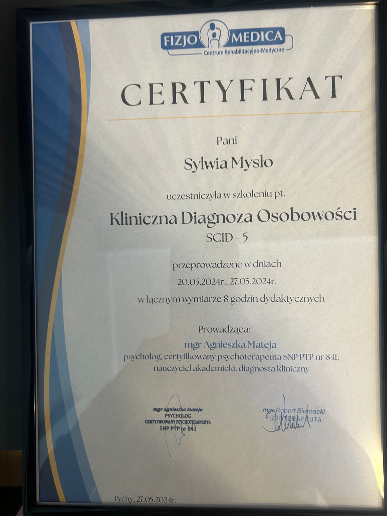 Wykonuję również test ACL, MMPI, SCID 5, który bada zaburzenia osobowości oraz szeroko ujętą psychopatologię.