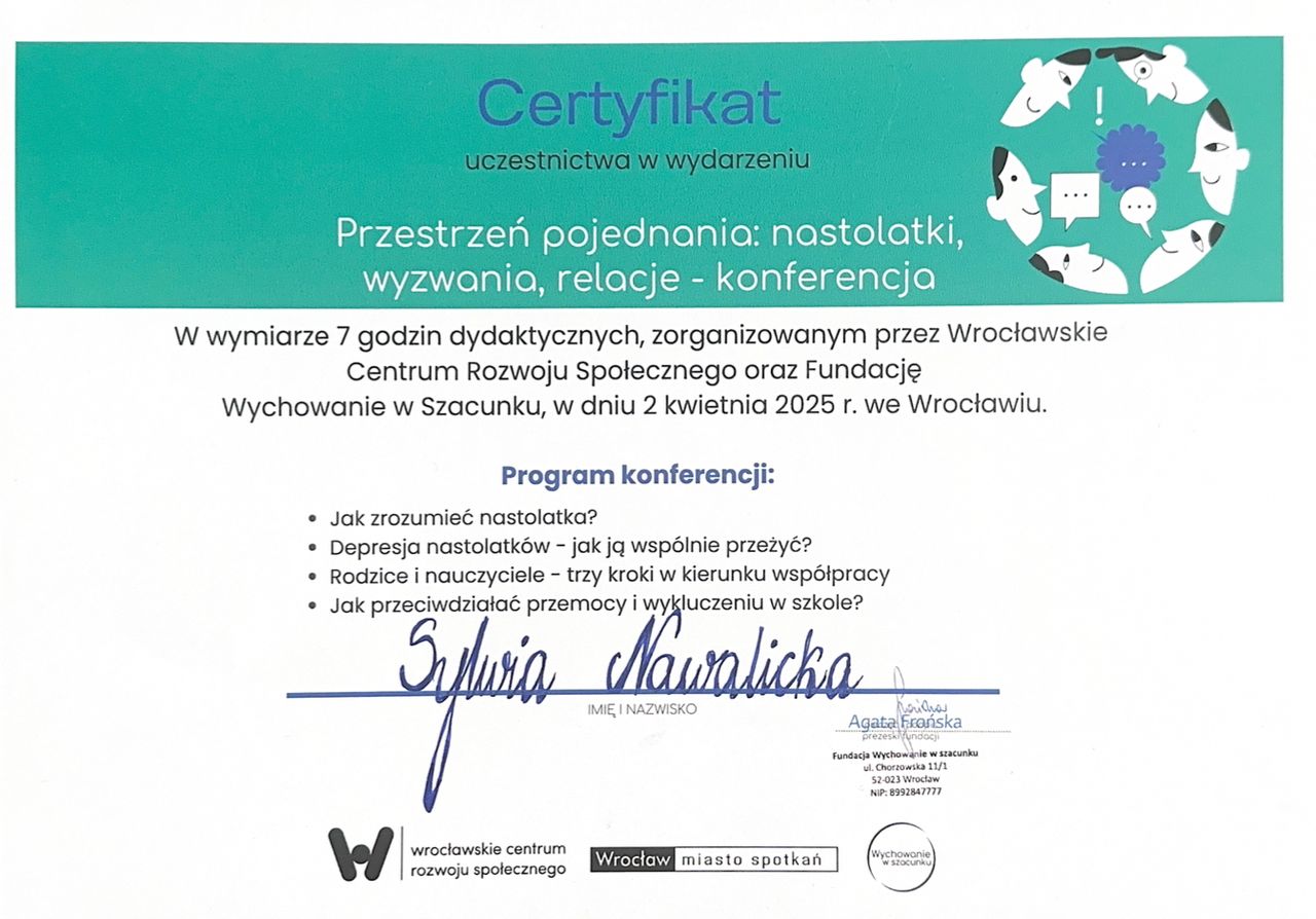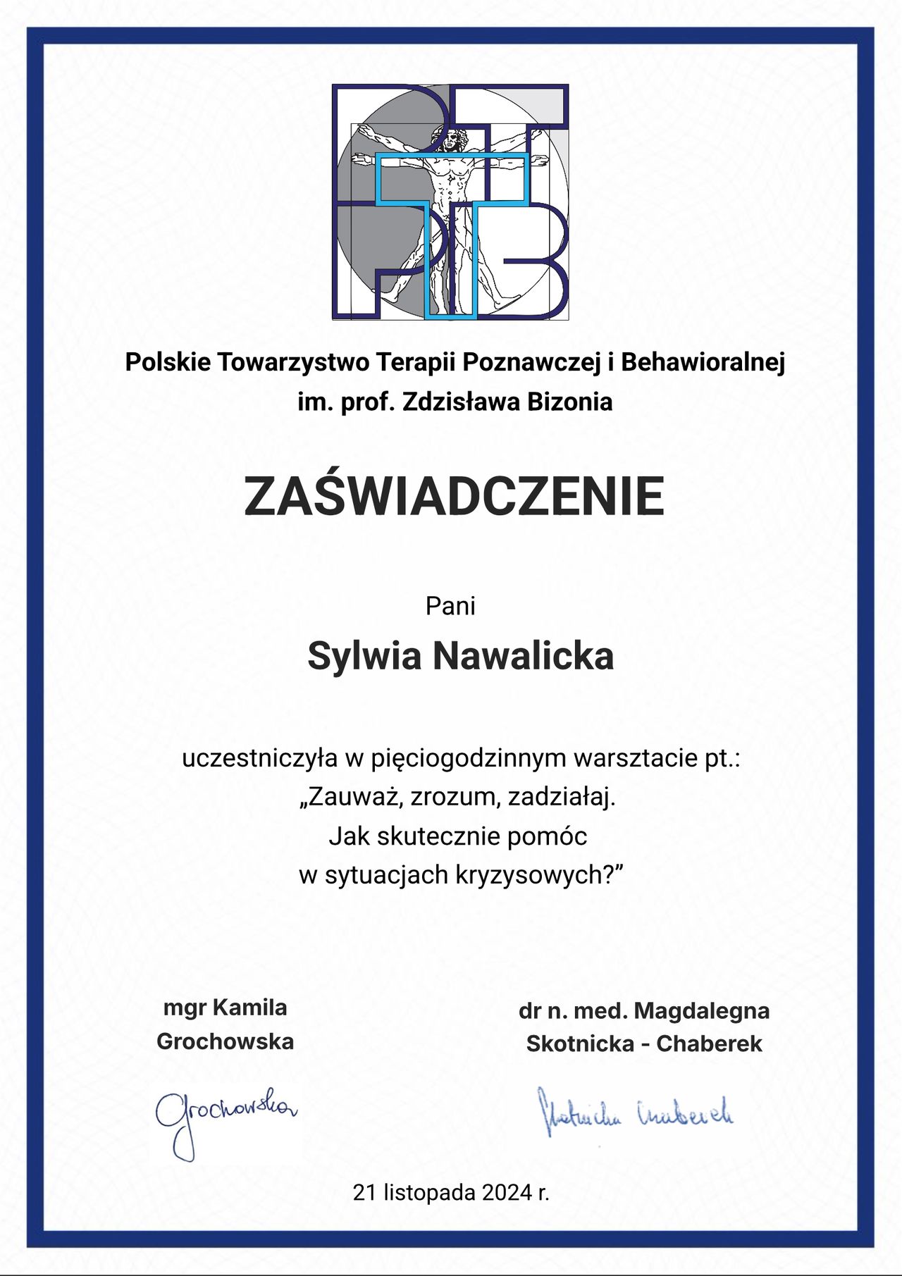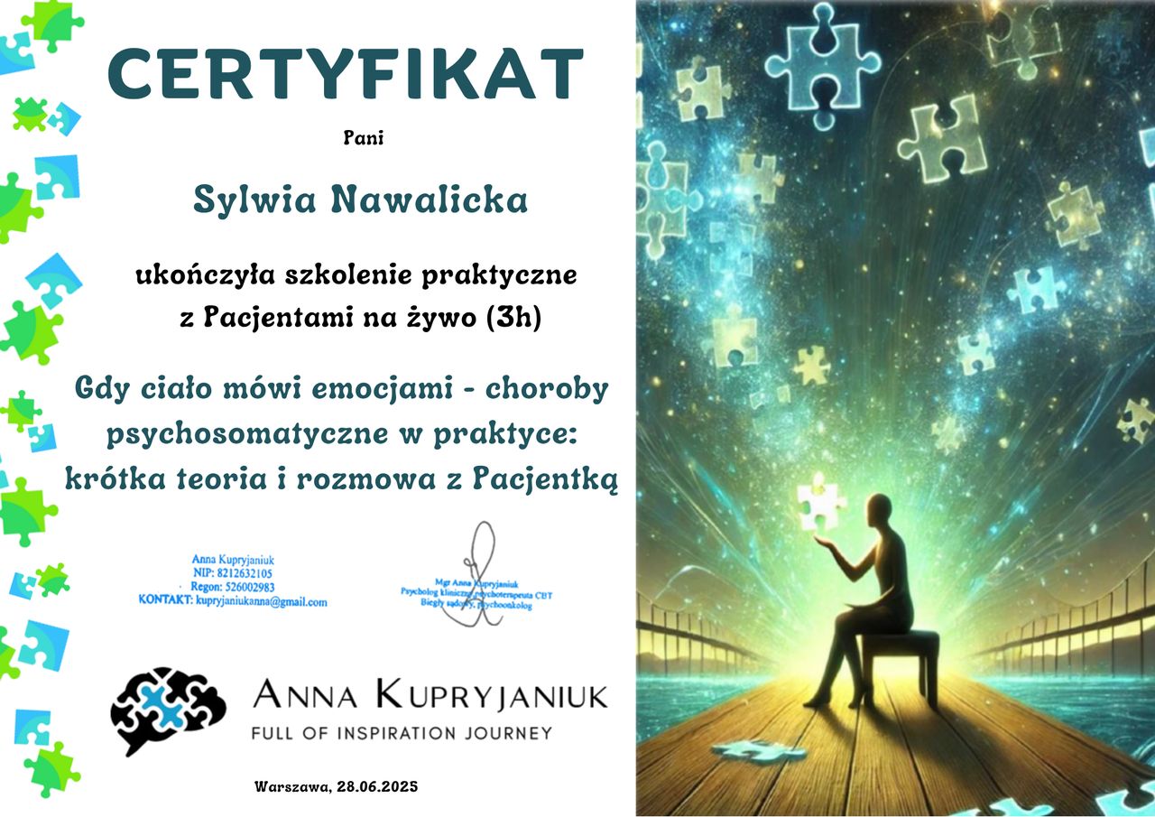 Pani Klaudio, bardzo dziękuję za tak ciepłe i pełne życzliwości słowa. Jest mi ogromnie miło, że docenia Pani moje zaangażowanie i że nasze spotkania były dla Pani realnym wsparciem. To dla mnie wielka satysfakcja i motywacja do dalszej pracy. Cieszę się, że mogłam towarzyszyć Pani w procesie i dziękuję za zaufanie oraz tak ciepłą rekomendację. Pozdrawiam ciepło, Sylwia Nawalicka