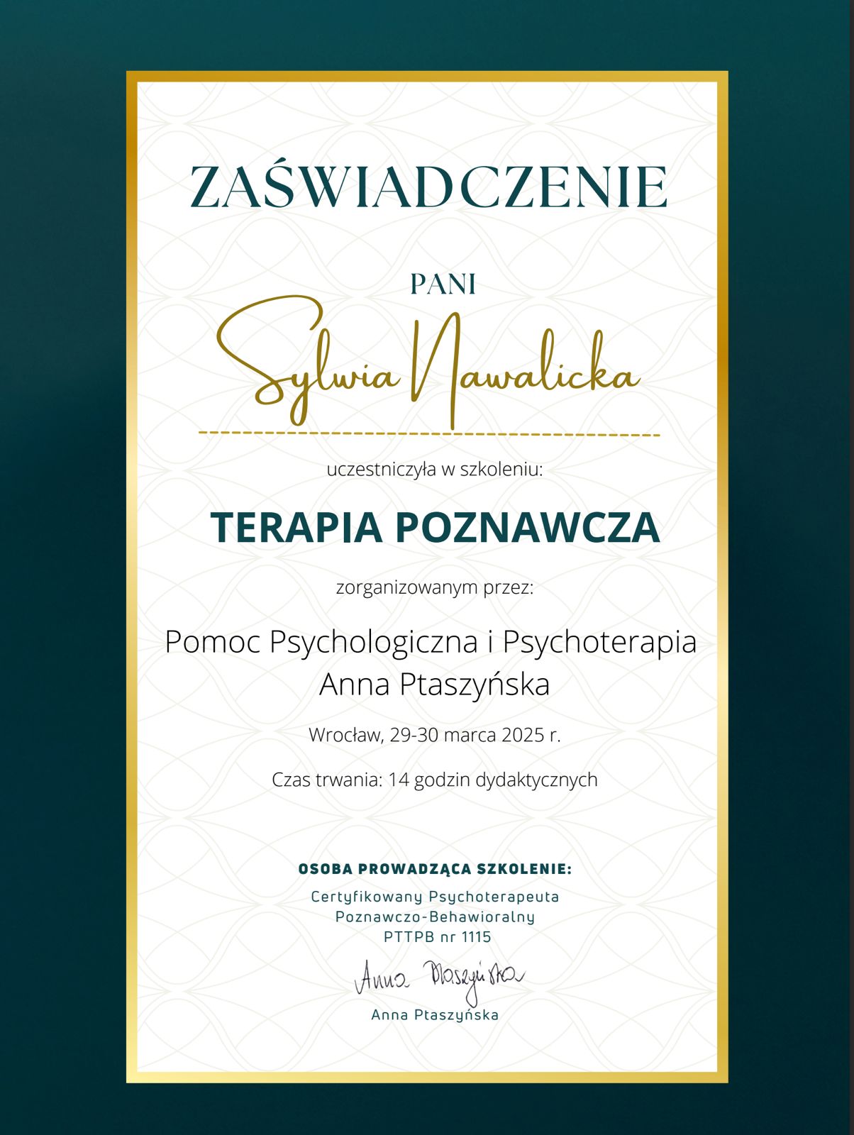 Serdecznie dziękuję za tak poruszającą i szczegółową opinię. Jest mi niezwykle miło czytać, że od pierwszego spotkania czuła się Pani wysłuchana, zrozumiana i traktowana z pełnym szacunkiem. Cieszę się, że nasze spotkania pomagają Pani lepiej rozumieć własne emocje, spojrzeć na trudności z nowej perspektywy i realnie pracować nad sobą. Życzę Pani wszystkiego dobrego na dalszej drodze i dużo uważności na własne potrzeby. Pozdrawiam ciepło, Sylwia Nawalicka